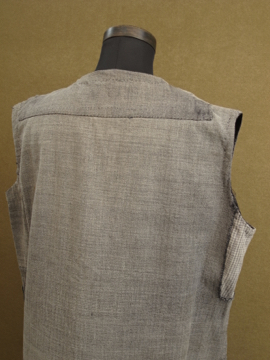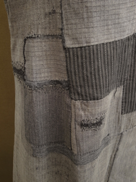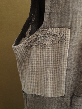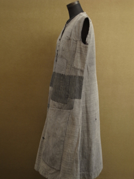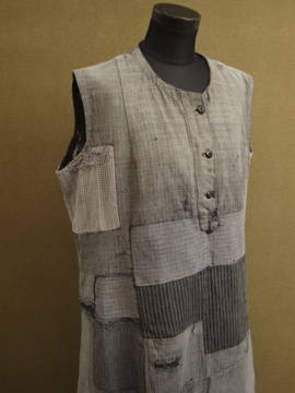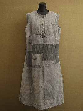 1930年から1940年代頃につくられたスリーブレス・ドレス。ベースは中厚手のごま塩ヘリンボーン織りコットン素材、数種類のコットンの布地でパッチワークされています。布地はどれも良いもので味わい深く仕上がっています。かなり使い込まれているため、全体的に手縫いの直し痕や擦れ、穴などの経年の傷みがあります。ダメージを気にされない方、直しながらご愛用頂ける方にお勧めいたします。