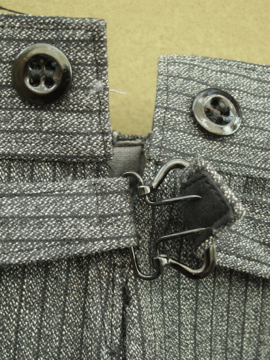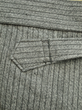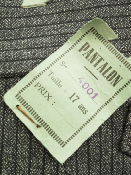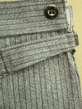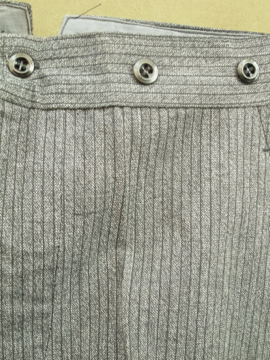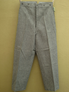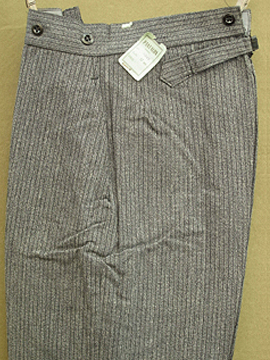 1940年代頃につくられたデッドストックのパンツ。ごま塩ストライプのとても良いコットン生地です。バックストラップがついているのでウエストサイズの調節ができます。フロントはボタンフライ、ウエストまわりにはサスペンダー用のボタンがついています。ボタンは全てメタル製です。ポケットは左右の2つ。長い間保管されていた為、折り目に若干の黄ばみがありますが、そのほかの状態は良いです。洗濯はしていません。