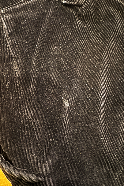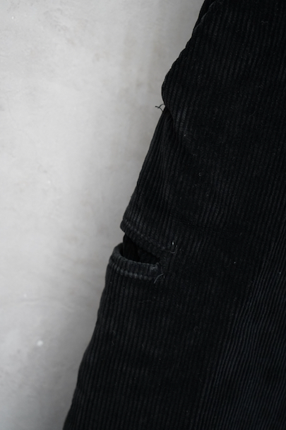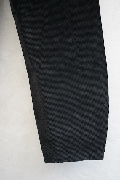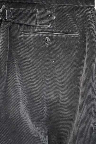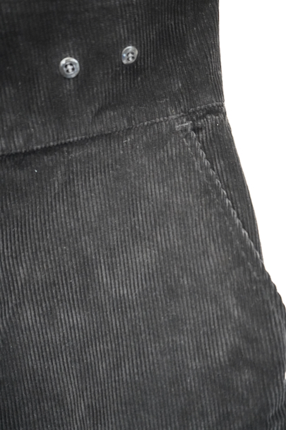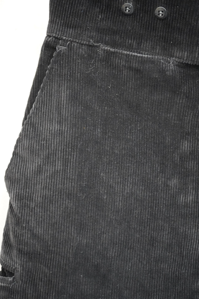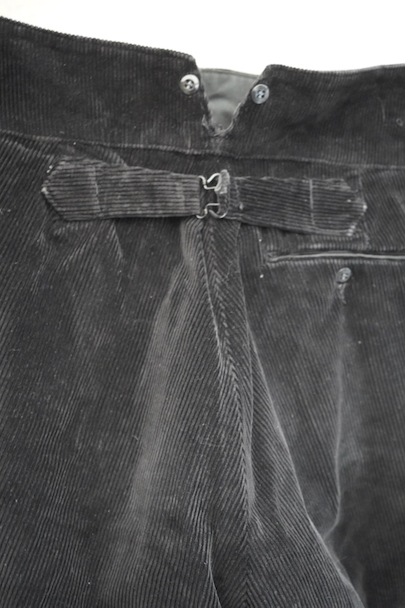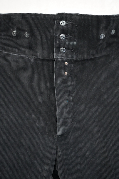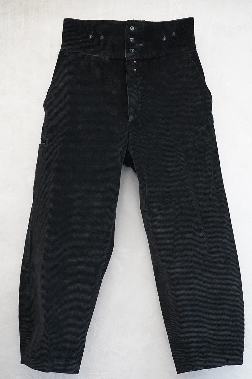 1960年代頃につくられたブラックコーデュロイのワークパンツ。ウエストライン幅が広く、3連ボタンが特徴的な良いデザインの品です。バックシンチ、サスペンダー用のボタン、フロントはボタンフライでホックもついています。セミバルーンの良いシルエットです。左ヒップに小さい直し痕がありますが、全体的な状態は良いです。
