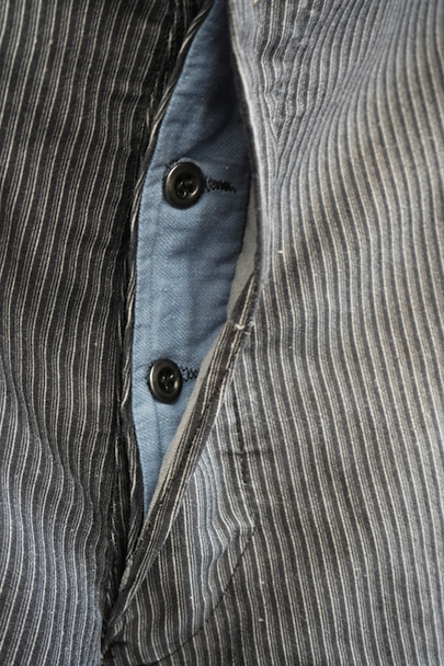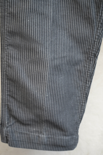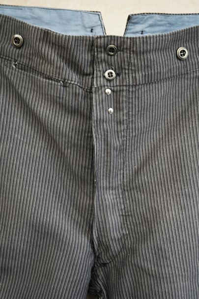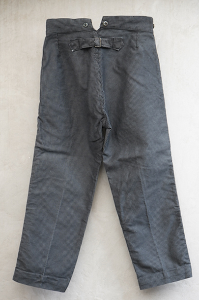 20世紀中期頃につくられたワーク・パンツ。ストライプ柄がプリントされたコットン・モールスキン素材です。フロント・トップが2連のボタン留めになった少し広めのウエストラインにはサスペンダー用ボタン、バックシンチ、フロントはボタンフライです。ボタンはメタル製のものがついています。使用感は無いですが、センターの折り目の部分に少し白く線が入っています。
