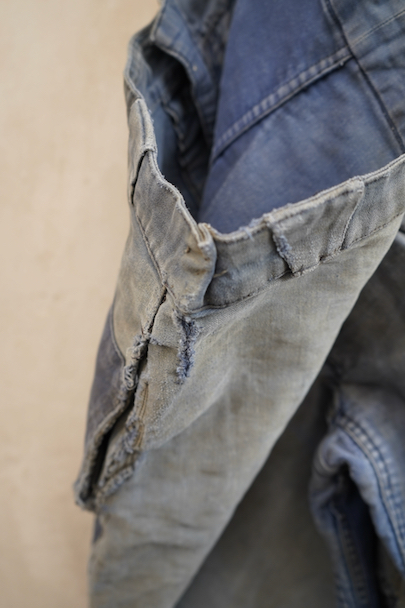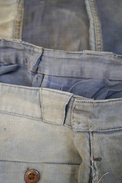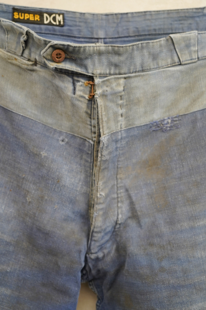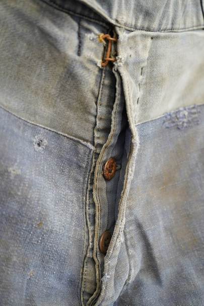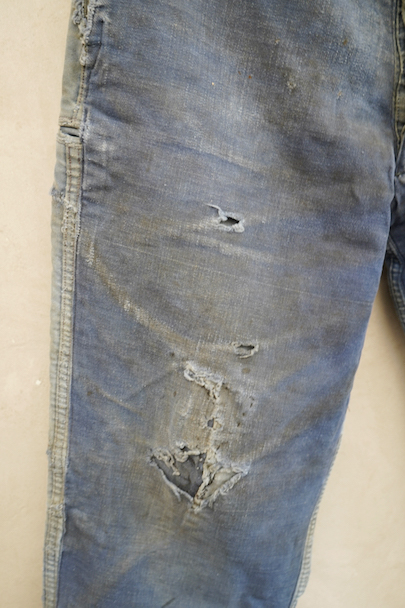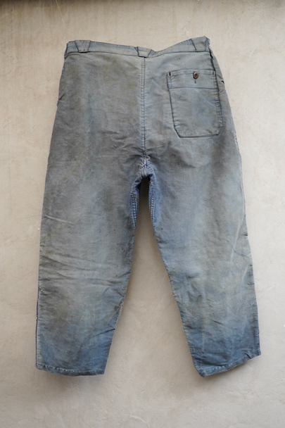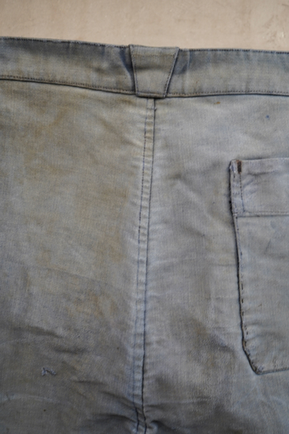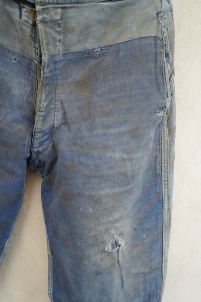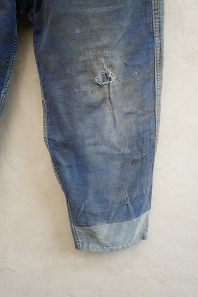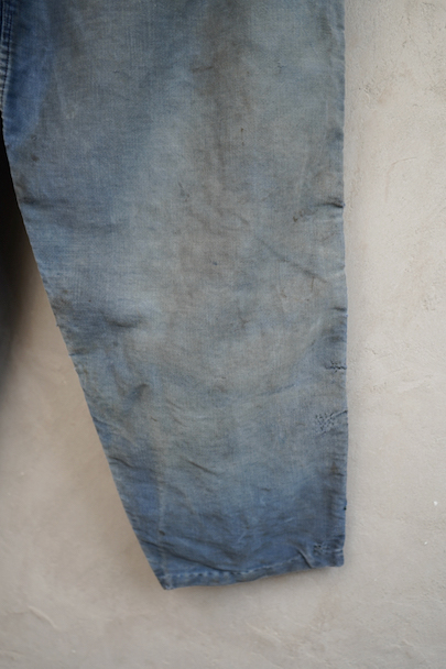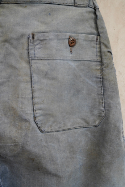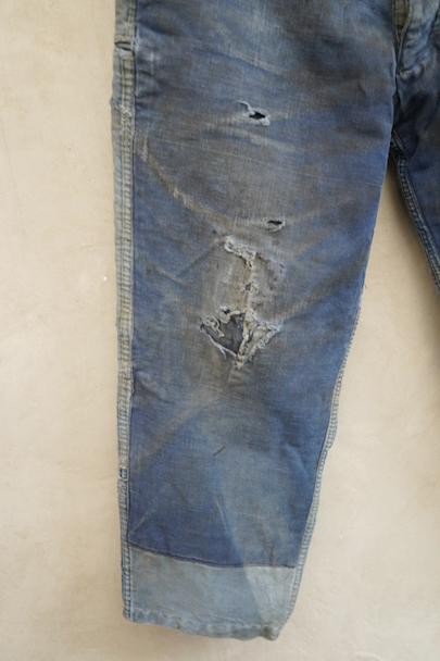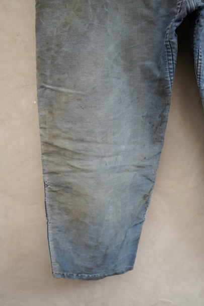 1940年代頃までに作られたブルー・モールスキンのワーク・パンツ。フロント部分に大きく布が当てられています。逆台形のベルトループ、フロントはボタンフライ。ウエストの左右でサイズが詰められています。解くと6cm程ウエストのサイズがアップします。ボタンや金具にサビ、全体的に擦れや穴、直し痕、シミなど、かなり使い込まれていますが良い味わいがあります。膝の穴は裏に布が当てられており貫通はしていません。