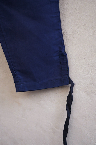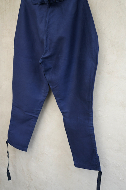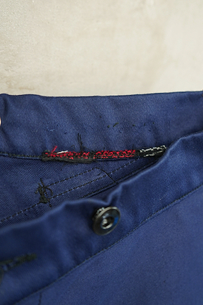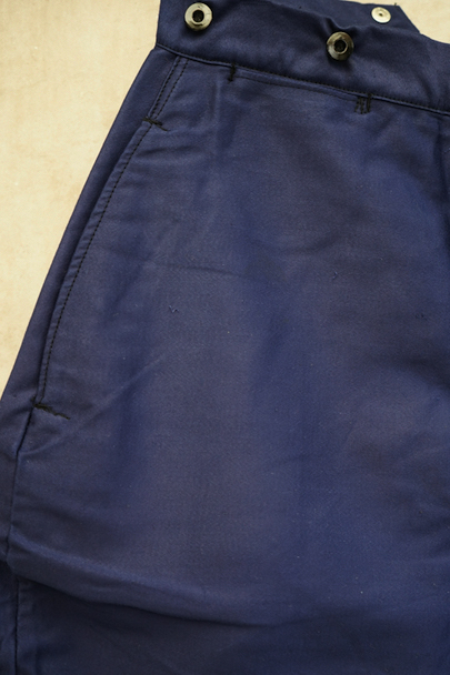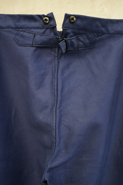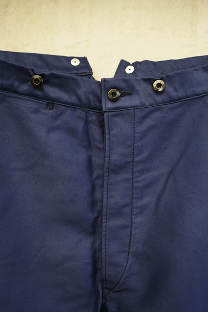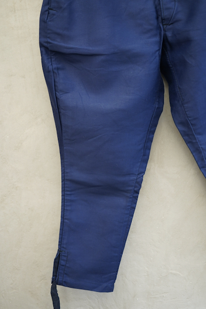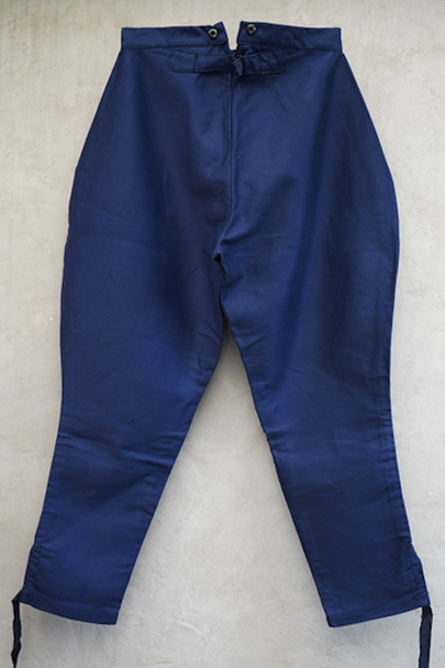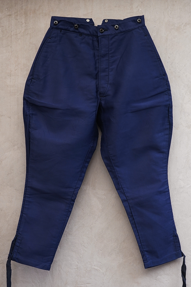 20世紀中期頃につくられたブルー・モールスキン素材で作られた珍しいジョッパーズ。タグは切れてなくなっていますが、"Adolphe Lafont"製のようです。フロントはボタンフライ、ウエストラインにサスペンダー用ボタン、バックシンチ。ボタンはメタルの打ち込みボタンです。裾から10cm程切れ込みが入っており、テープを巻き付けて留める仕様になっています。未使用品を一度洗濯しています。状態はとても良いです。
