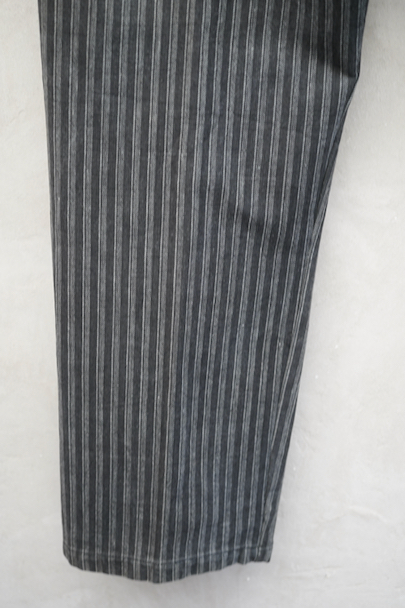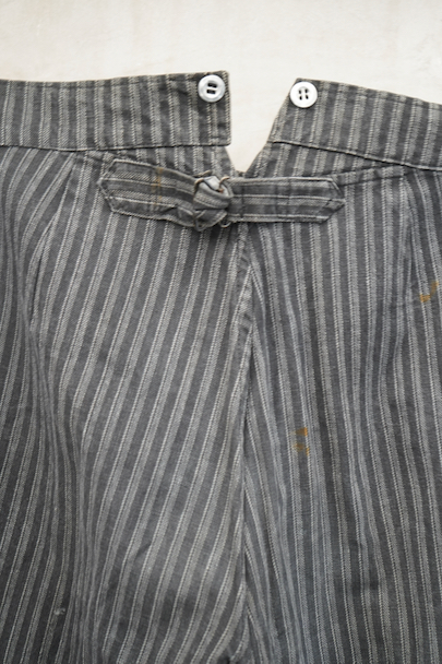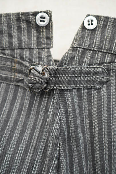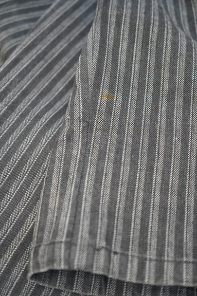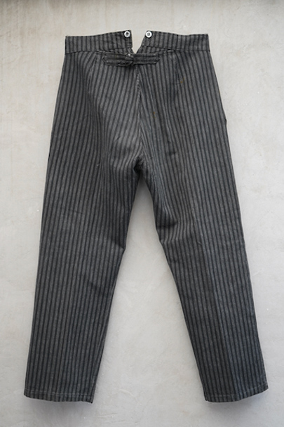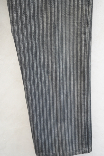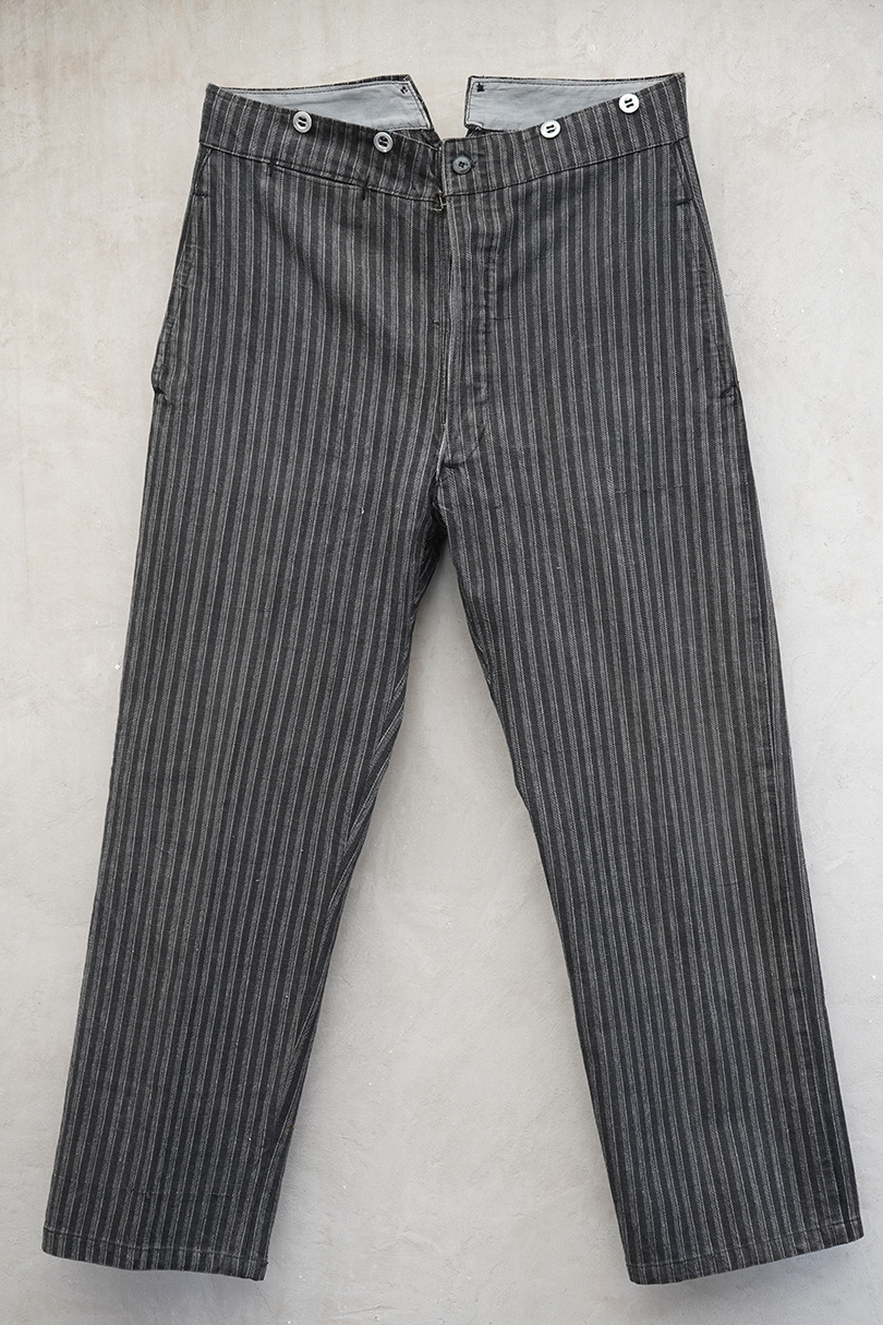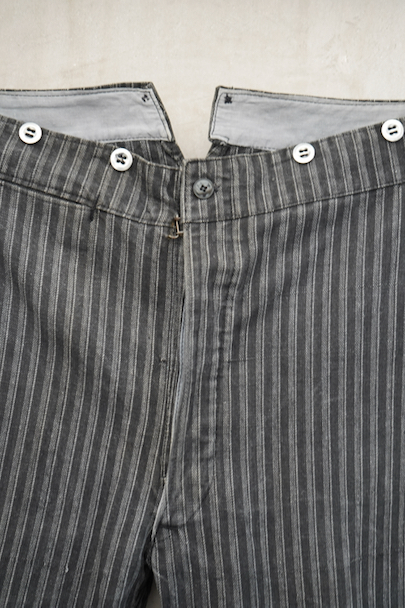 1940年代頃につくられたストライプ織り柄のグレー・コットン・ワークパンツ。 フロントはボタンフライ、ウエストにサスペンダー用ボタン、バックシンチ。ボタンはメタル製(フロント・トップのみプラスチック製)。前立て横に小さい直し痕、バック等にサビ染みがあります。