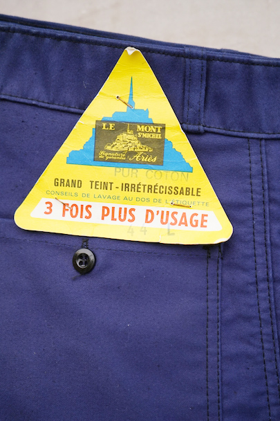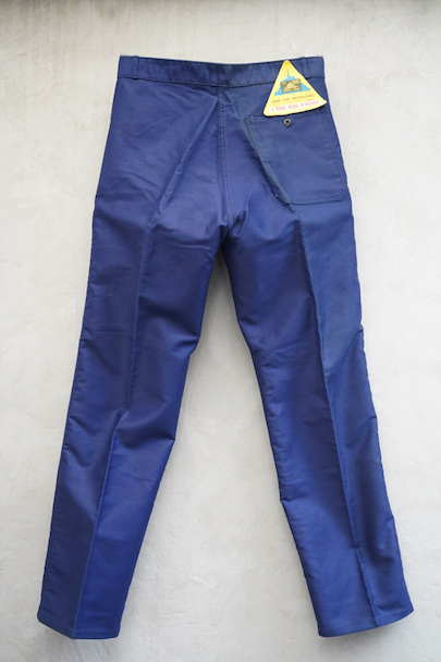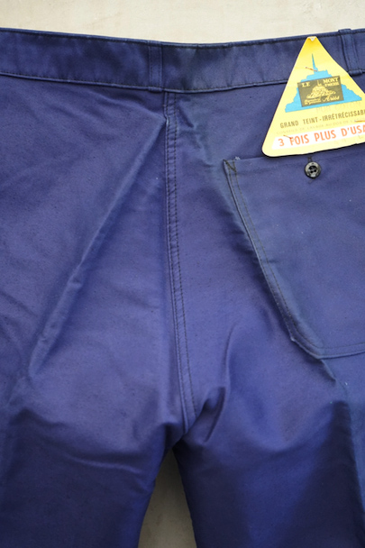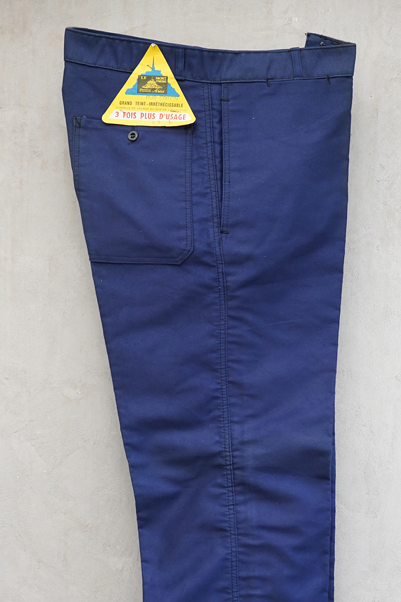 20世紀中期頃につくられたブルー・モールスキンのワークパンツ。老舗メーカー"Le Mont St Michel"のもの、フラッシャー付きのデッドストックです。プリントタグです。フロントはボタンフライ、ウエストにはベルトループ。表記サイズは44L。 多少色焼けがあります。