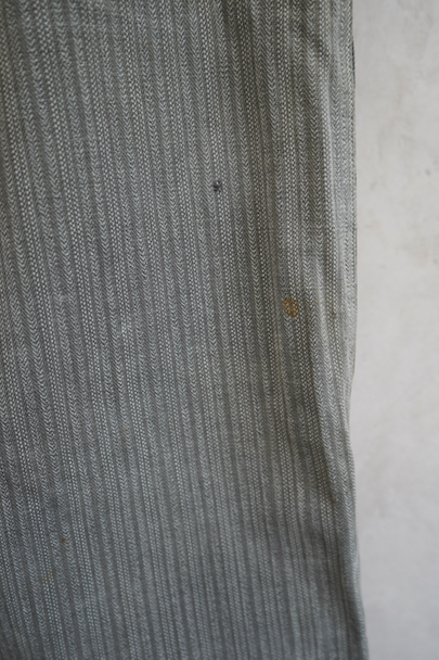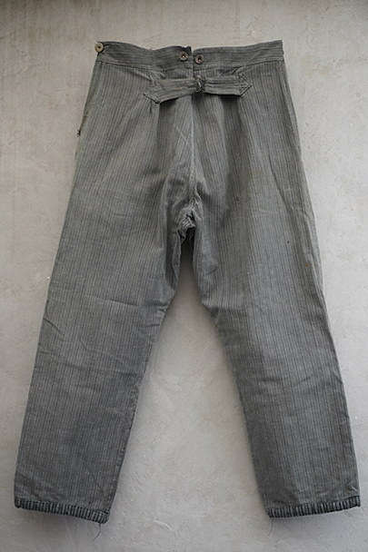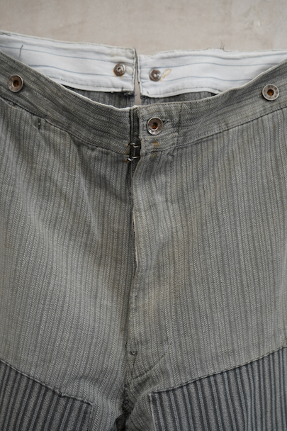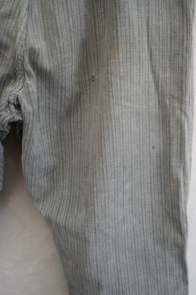 フロント部分に大きく布を接いだストライプ柄コットンのワークパンツ。1940年代頃のものだと思います。ウエスト・ラインにサスペンダー用ボタン、バックシンチ、フロントはボタンフライ。ボタンは色々なものにつけ替わっています。直し痕、擦れや小さな穴 、シミなどの経年の傷みがあります。ウエストはバックシンチを留めた状態で76~84cm、外した状態で90cmです。
