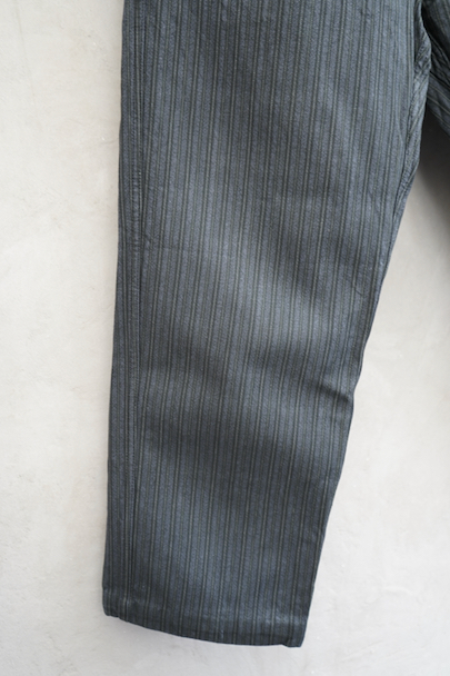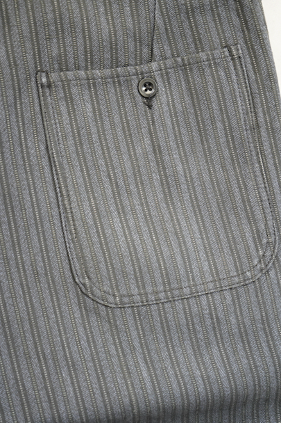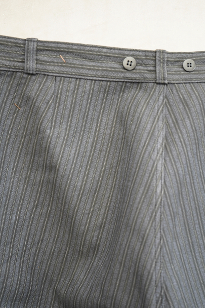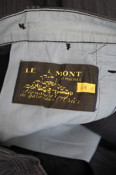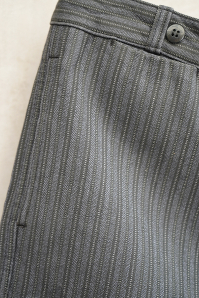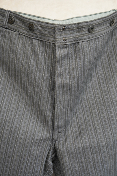 20世紀中期頃につくられたワークパンツ。"Le Mont St Michel"製、プリントタグ、デッドストックを一度洗濯しています。グレーのストライプ柄のコットン・ピケ素材です。フロントはボタンフライ、ウエストにサスペンダー用ボタンとベルトループ。左前にはベルトループがついていません。保管中の傷みはなく、状態はとても良いです。