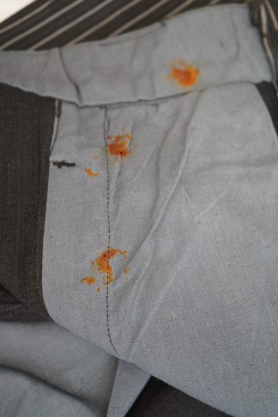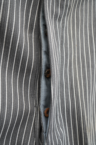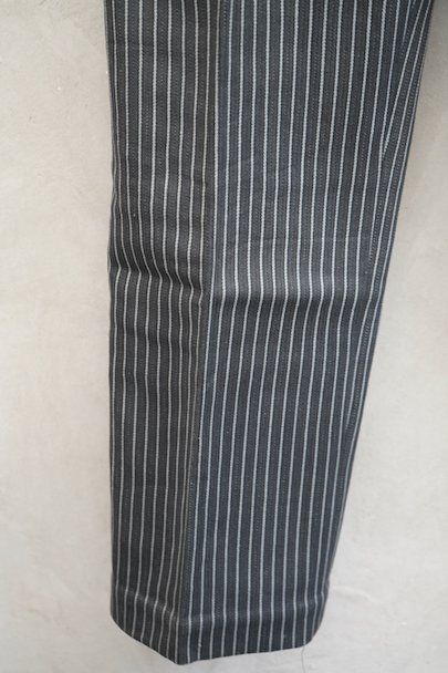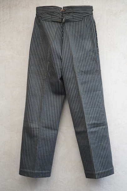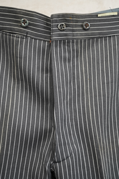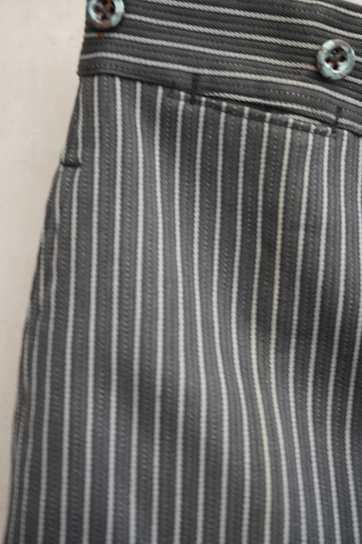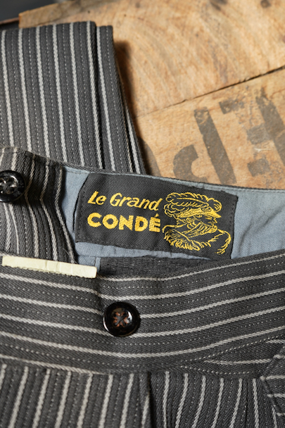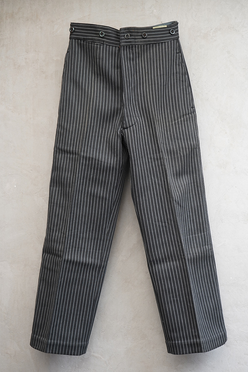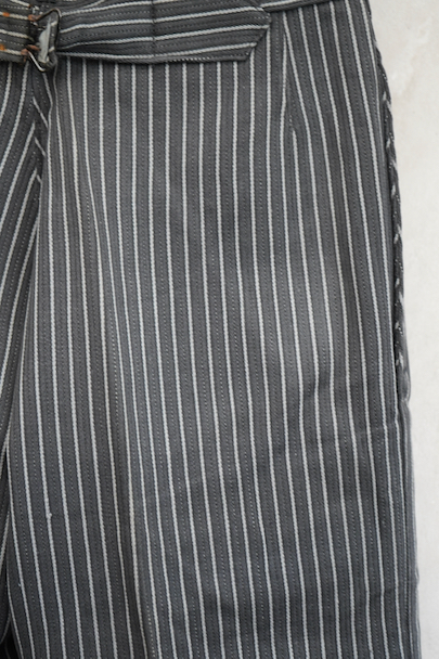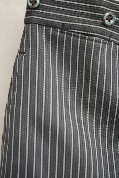1940年代頃までにつくられたワークパンツ。デッドストックを一度洗濯しています。ブラックにグレーのストライプ柄のコットン・ピケ素材、良い布地です。少し裏起毛しています。"Le Grand CONDE"素敵な刺繍タグがついています。フロントはボタンフライ、ウエストにサスペンダー用ボタン、バックシンチ。ボタンは黒塗りのメタル製、ボタンや金具にサビが見られ、周辺にサビ染みがあります。シミは裏地など着用すると見えない部分です。小さめサイズで女性にお勧めです。