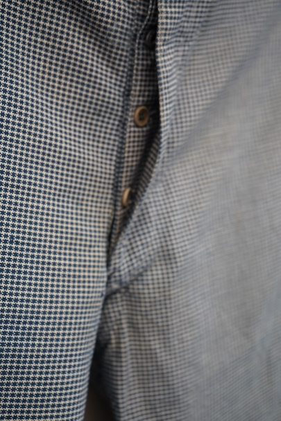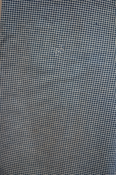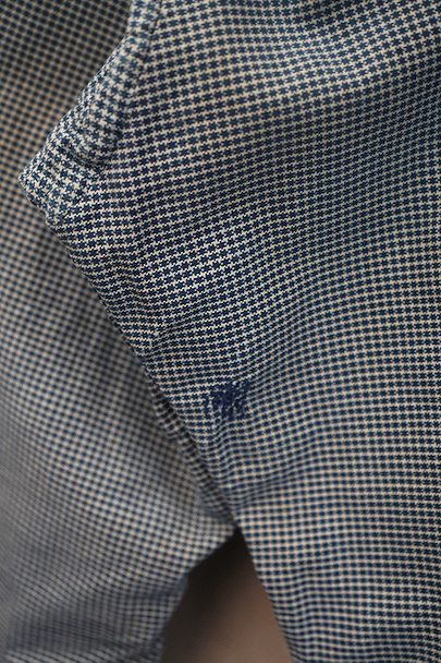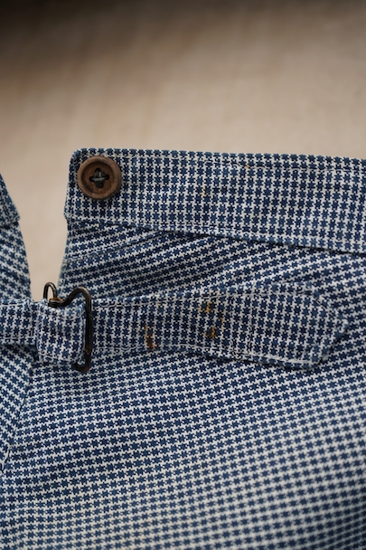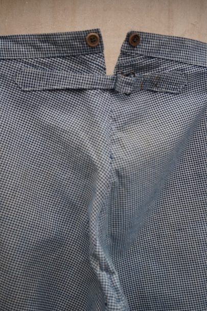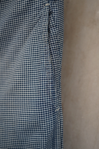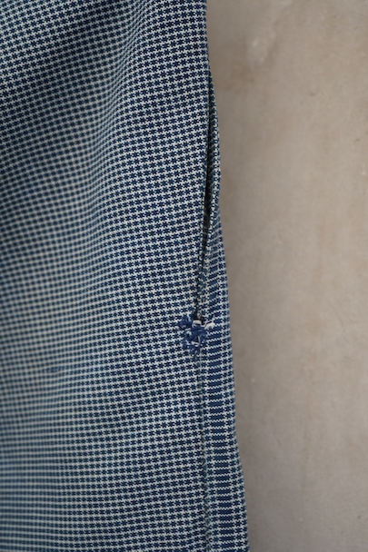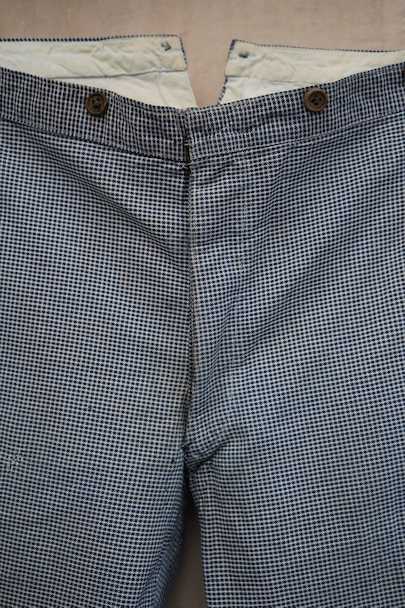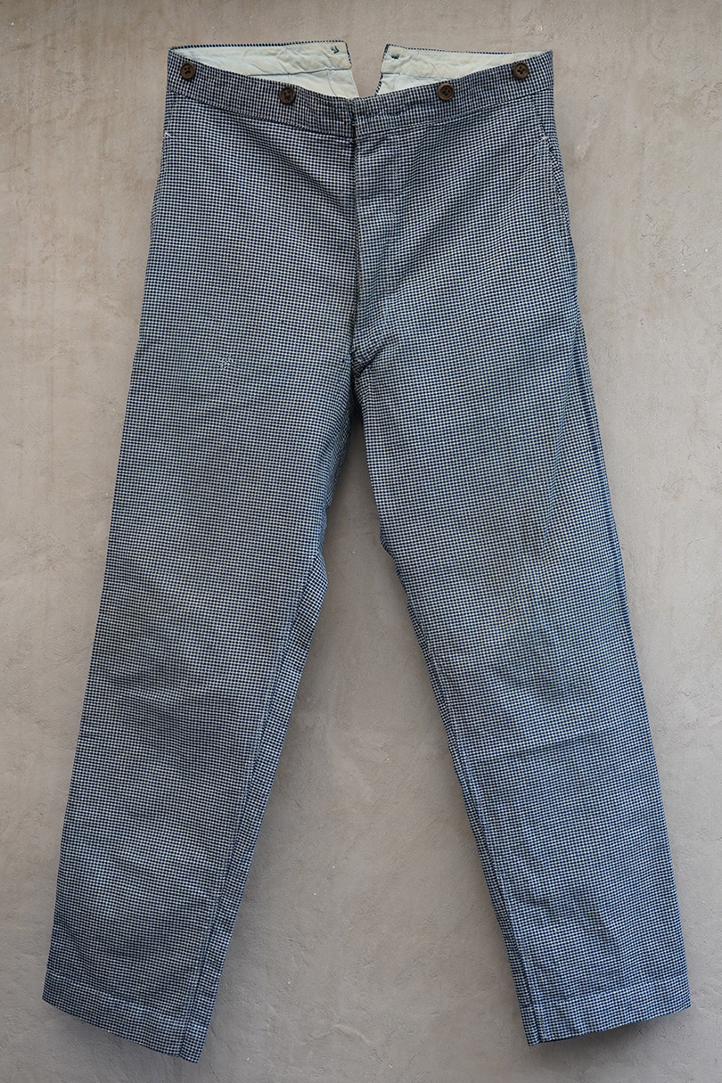 1930年代頃までにつくられたインディゴの千鳥格子柄のワークパンツ。比較的細めです。フロントはボタンフライ、ウエストラインにサスペンダー用ボタン、バックシンチ。ボタンは木製の風合いの良いものがついています(前立て部分の一つがメタル製につけ替わっています)。フロント右上部に1.5cm、右ポケット口の下部に1cm、右後ろの股近くに2cm弱の直し痕があります。その他、小さい直し痕や小さい穴、経年のシミやほつれがあります。