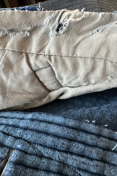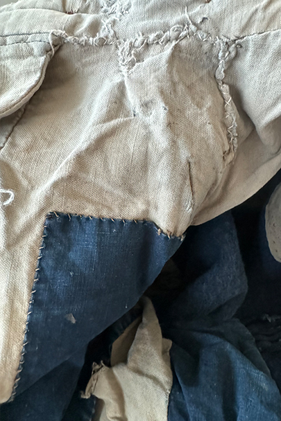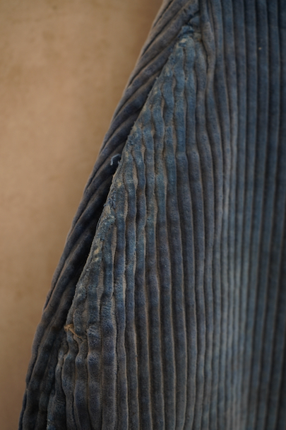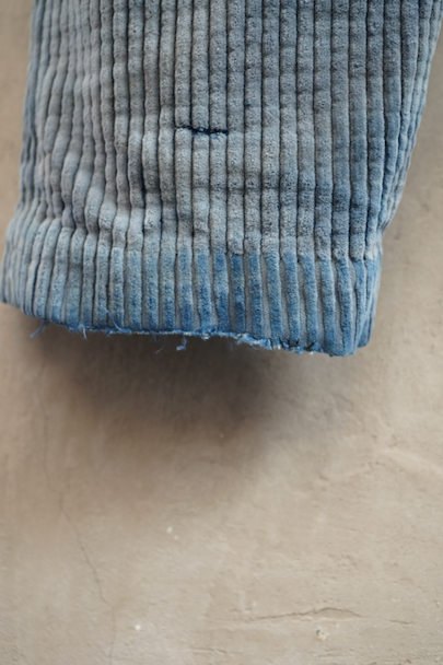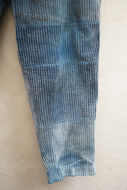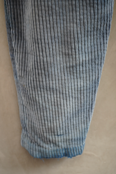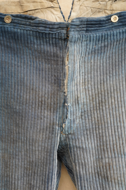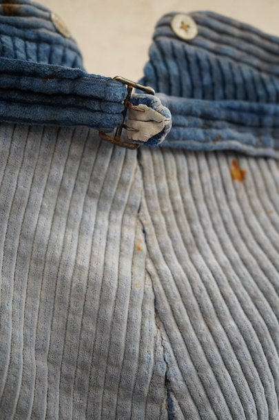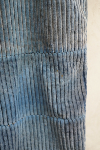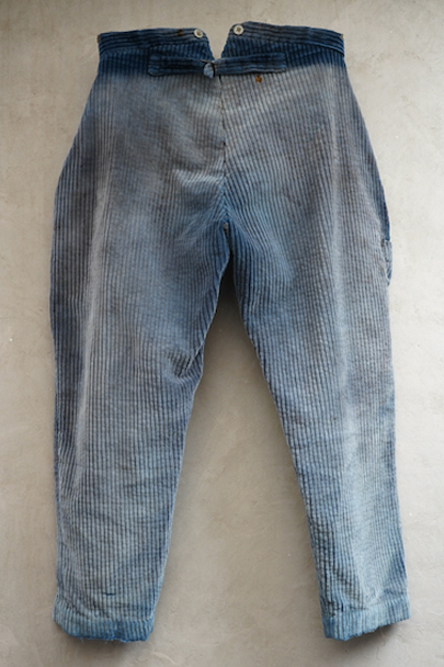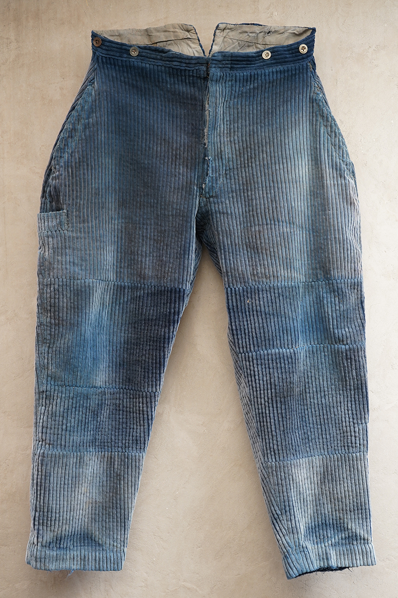 1930年代頃までにつくられたとても珍しい超太畝ブルー・コーデュロイが使われたワーク・パンツ。締まったウエストラインから腰に向けて大きく膨らみ裾に向かってテーパードしたシルエット、綺麗な形のパンツです。フロントはボタンフライ、ウエストラインにサスペンダー用ボタン、バックシンチ。ボタンはオリジナルは目たつボタンのようですが、様々なものにつけ替わっています。ポケットは左右とウオッチ・ポケット、右サイドにツール・ポケットがあります。膝辺りで共布が接いであります。全体的に擦れ、穴や直し痕、褪色やシミがありますが、着用に問題はないです。