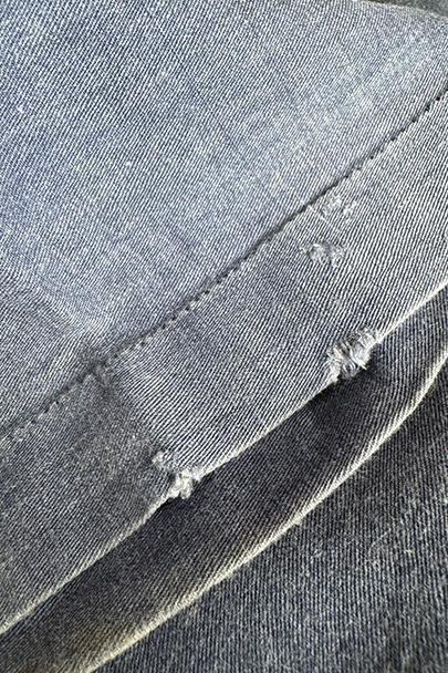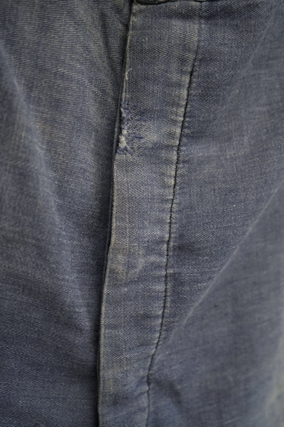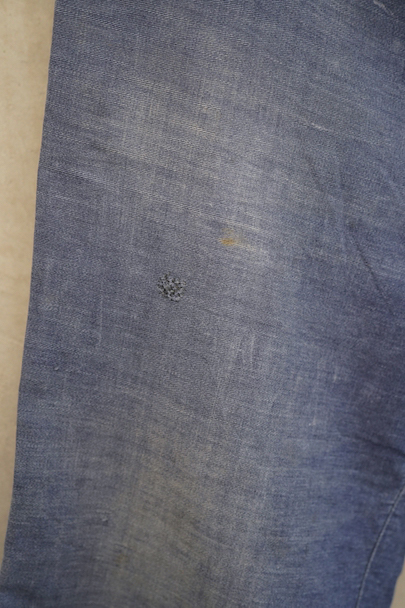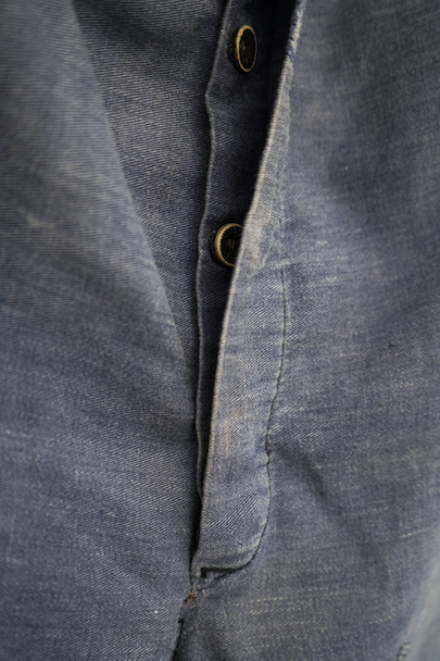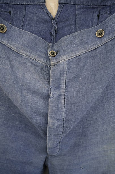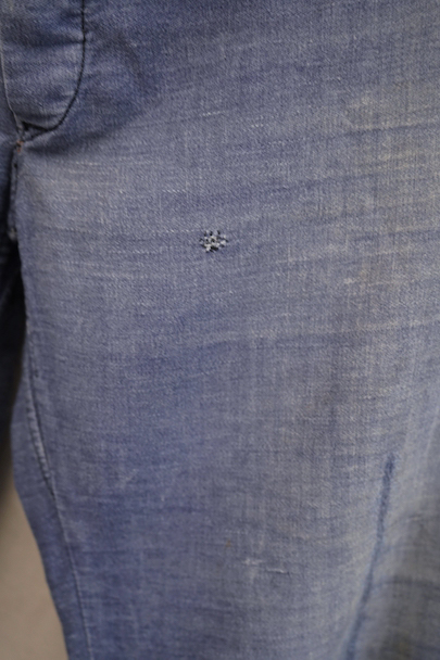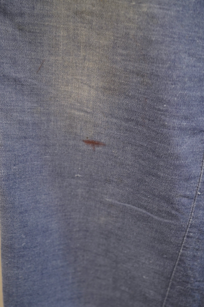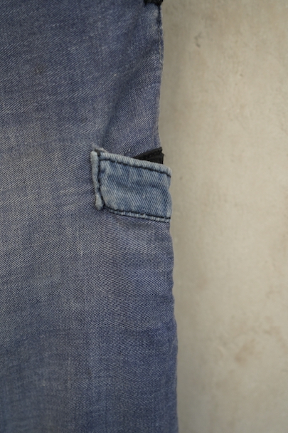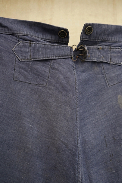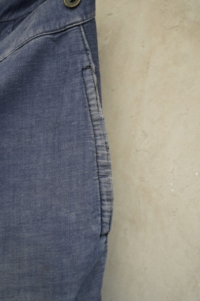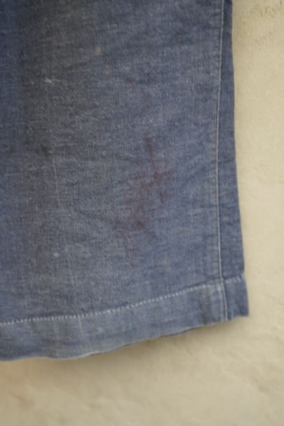 1930年代頃につくられたワークパンツ。ブルーのリネン・コットンのツイル素材、薄手で柔らかな生地です。フロントはボタンフライ、ウエストラインにサスペンダー用ボタン、バックシンチ。ボタンは全てパピエ・マシェです。左サイドに後付けと思われるポケットがついています。左膝に大きく裂けを直した痕、フロント前立て部分に直し痕、右ヒップにシミ、右の裾に擦れや穴があります。その他、小さい直し痕やシミ、擦れなど経年の傷みがあります。