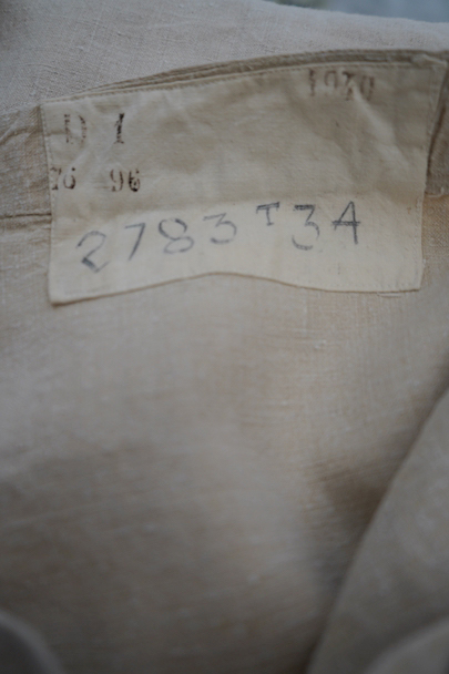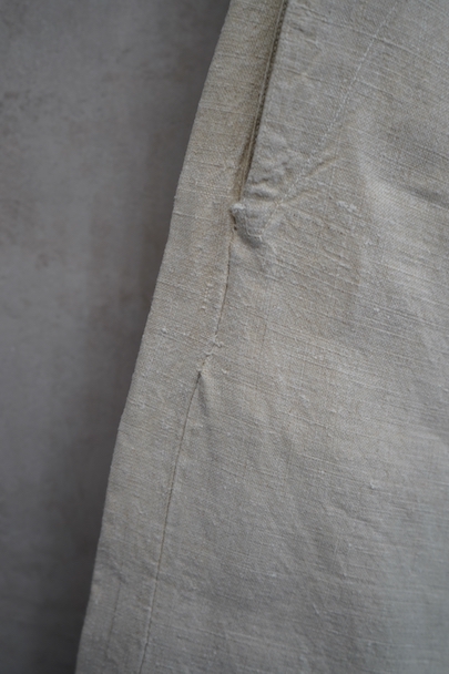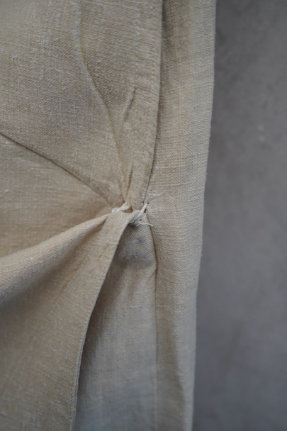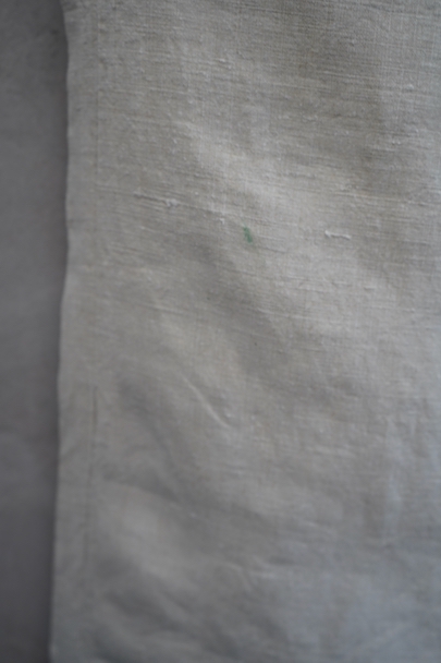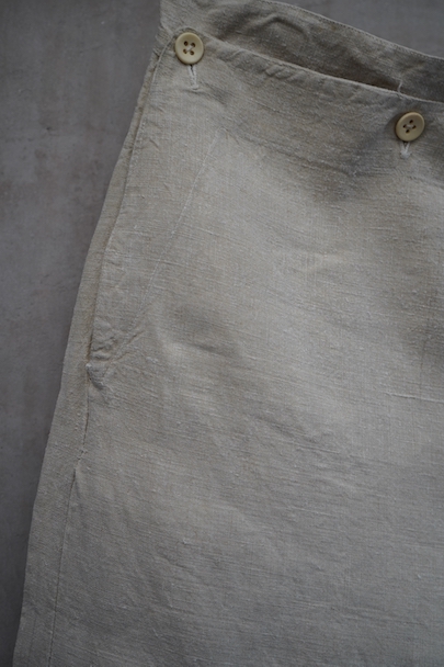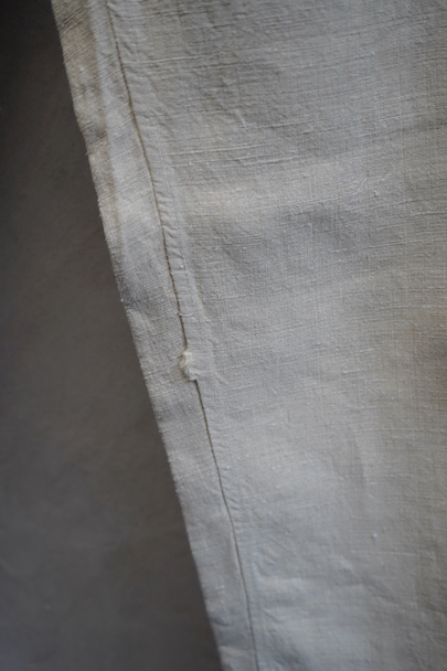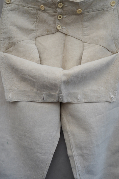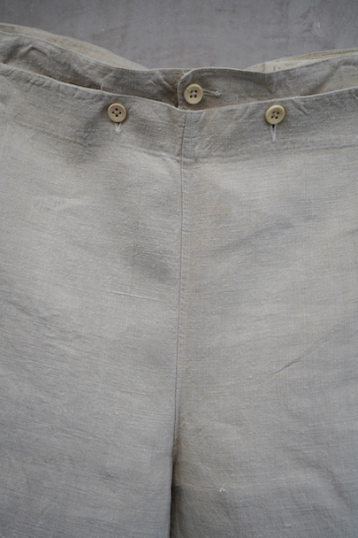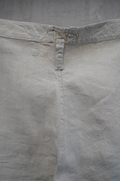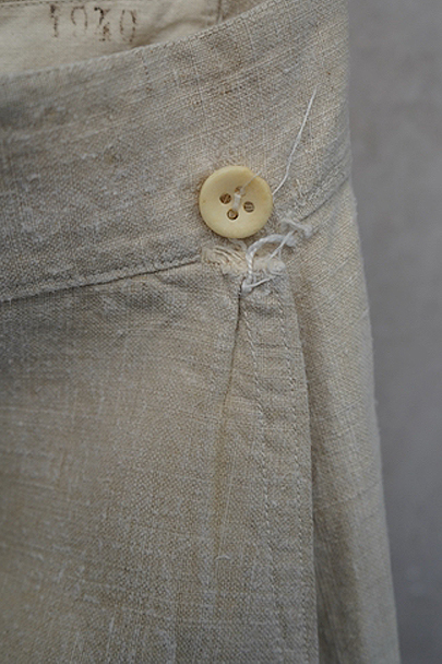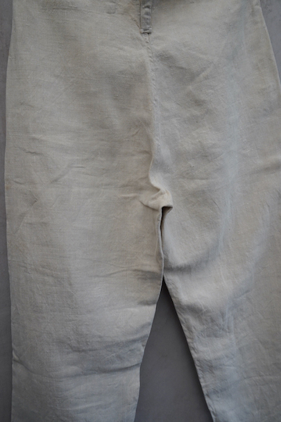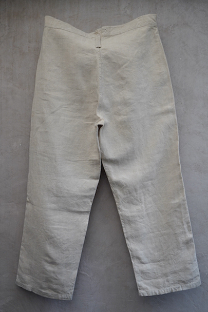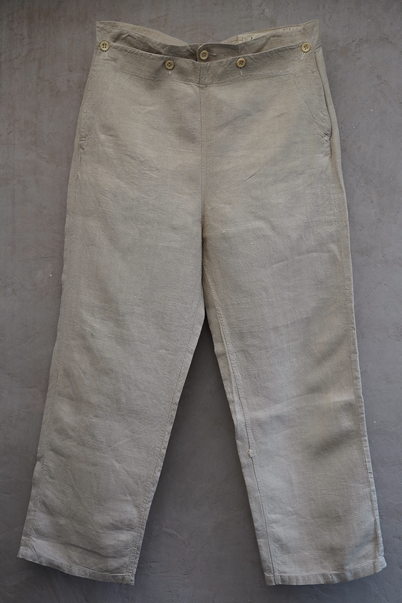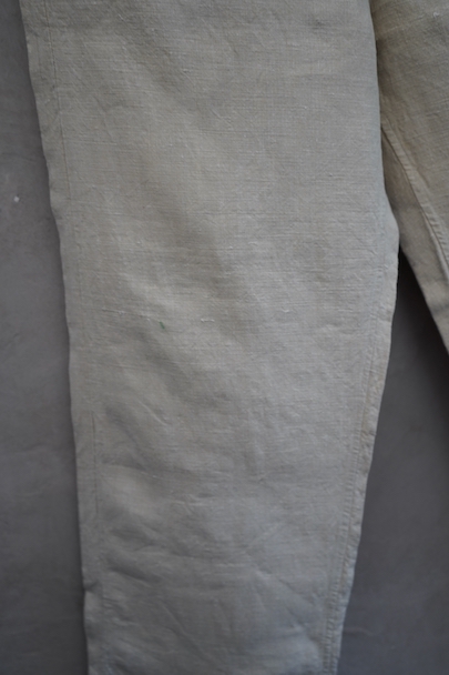 1940年代頃につくられたフランス海軍のセーラーパンツ。目の詰まったリネン素材、フロントが大きく開く仕様、フロントのカバーの内側には左右のポケットやウオッチポケットもついています。内側のタグに味わいのある書体、その上部に1940年のスタンプが読めます。ボタンはボーン製、手縫いのボタンホール。左ポケットの口の上部と下部の閂と周辺にほつれ、右ポケット下のアウトシームにほつれを直した痕が見られます。その他、多少のシミやほつれがあります。