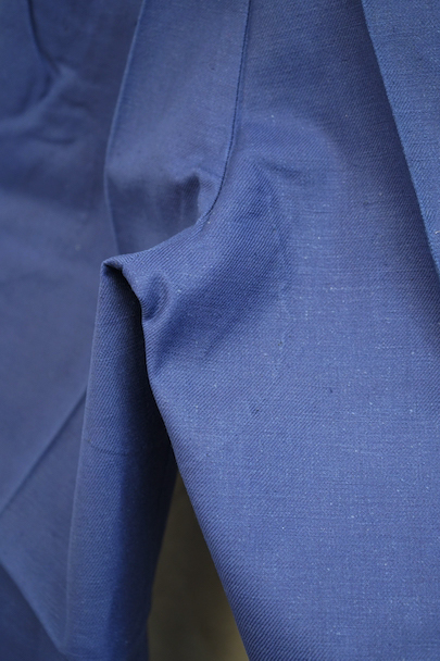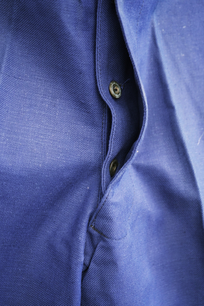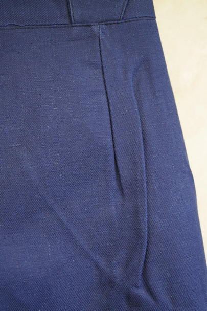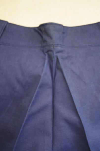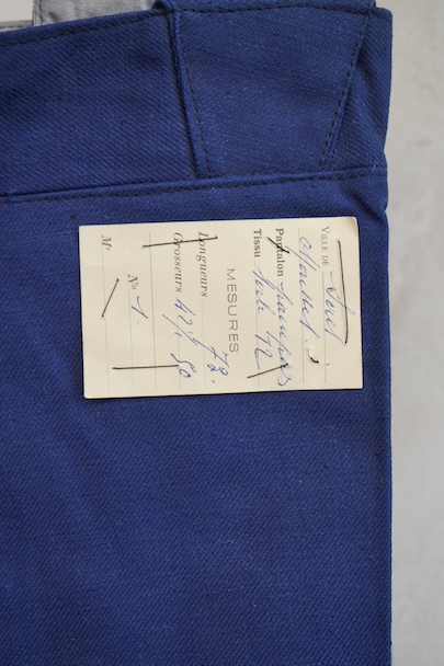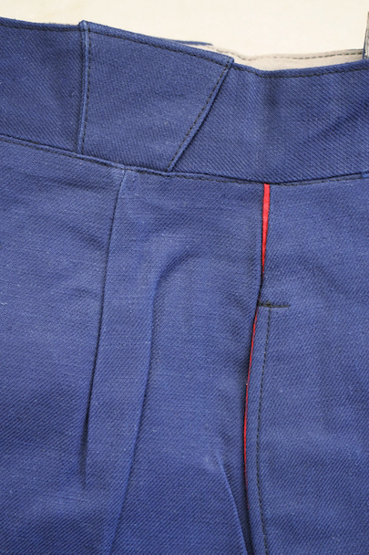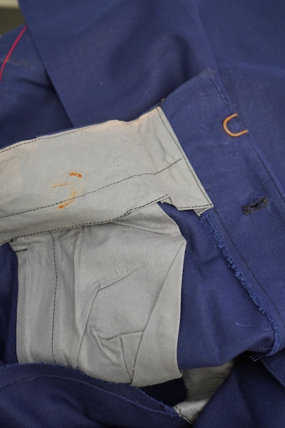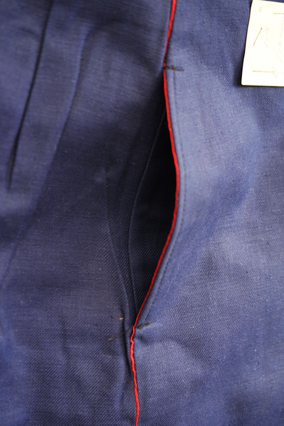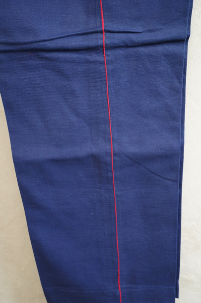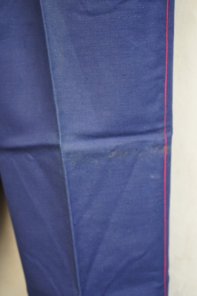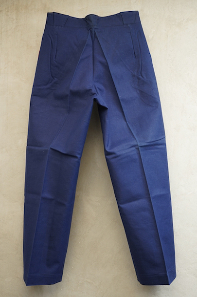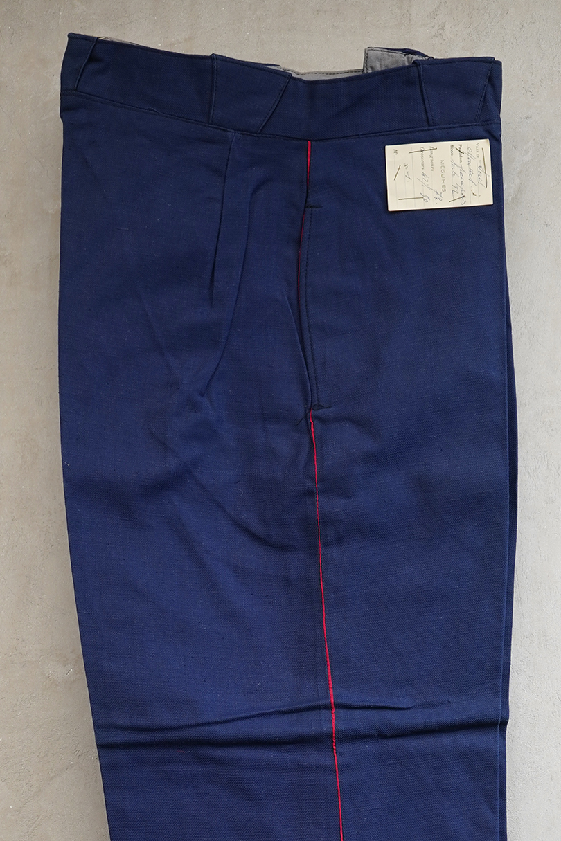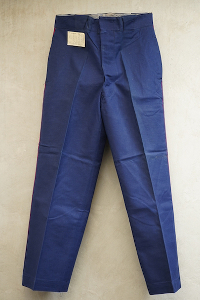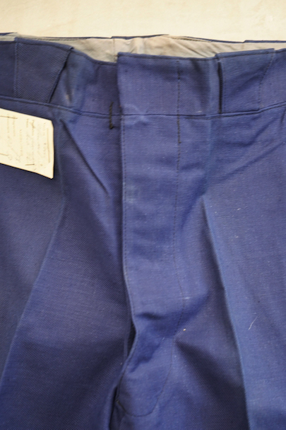 1940年代頃につくられたファイヤーマン・パンツ。紙タグのついた未使用品です。ブルーのコットン・ツイル素材、サイドに赤いラインが入っています。ウエスト周りに逆台形のベルトループ、フロントはボタンフライ、メタルボタンがついています。フロントのトップにはフックがついています(サビがあり、周辺にサビ染みがあります)。保管中についた汚れ、色焼けが多少あります。大きなダメージはありません。