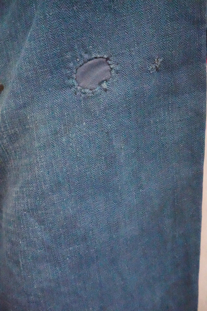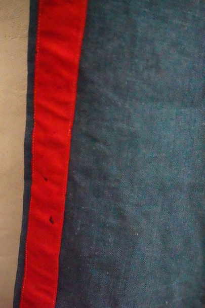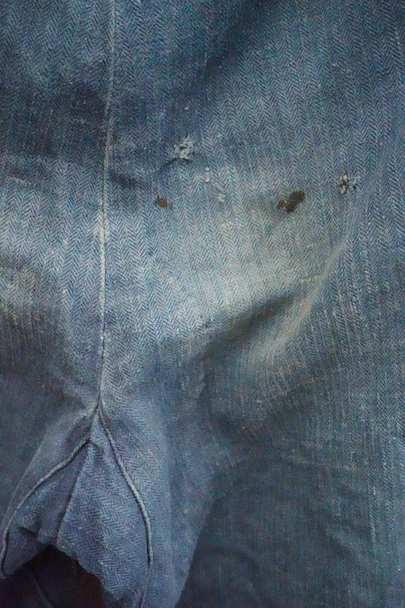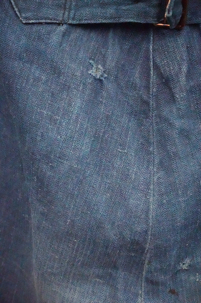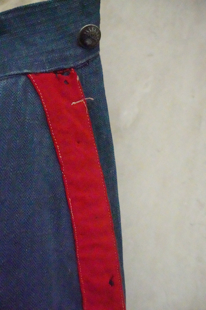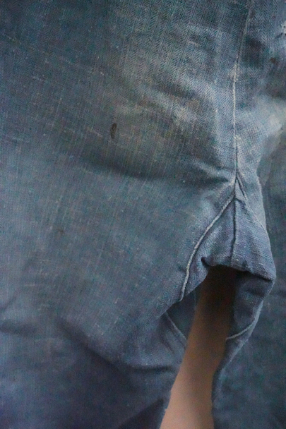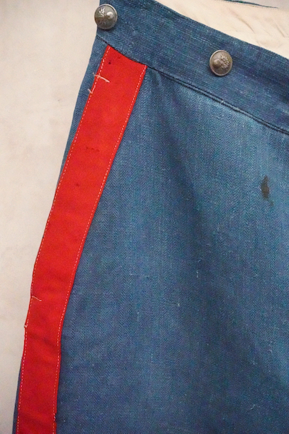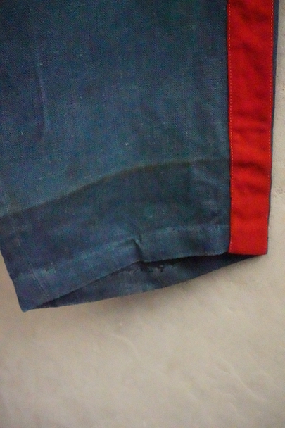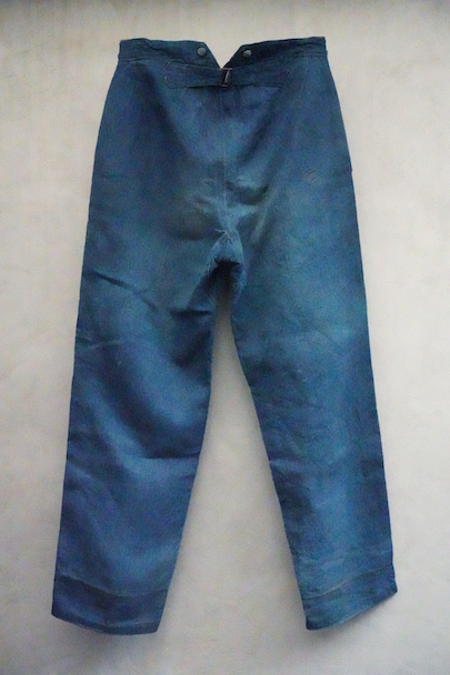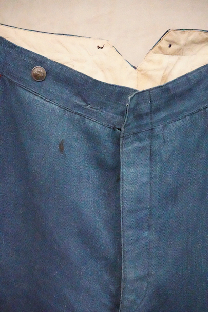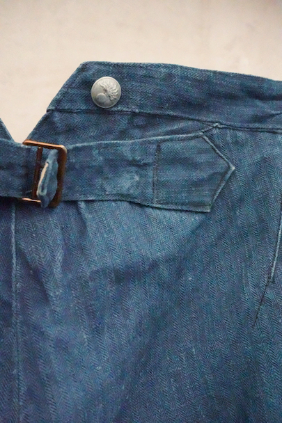 20世紀初期頃までにつくられたファイヤーマン・パンツ。インディゴのヘリンボーン織りのリネン地です。ウエストラインにサスペンダー用ボタン、バックシンチ、フロントはボタンフライ。サイドには赤いラインが縫い付けられています。サスペンダー用ボタンはメタル製、その他はパピエマシェのものがついています。ヒップ部分に3cmほどの穴を直した痕と4つの小さい直し痕あります。裾近くに折り痕、その他、シミや直し痕、多少のほつれ、赤いラインに穴や劣化がありますが、布地はしっかりとしています。