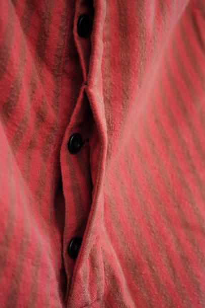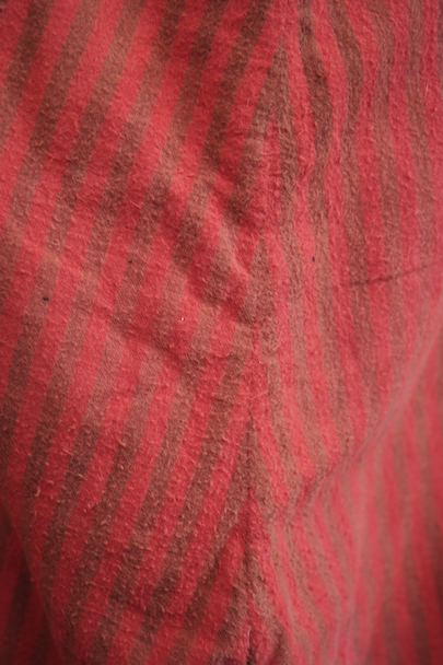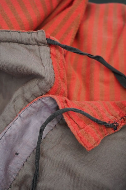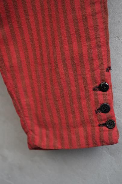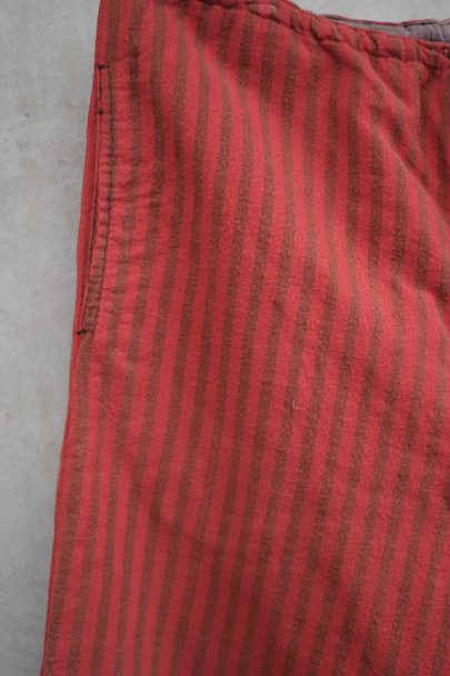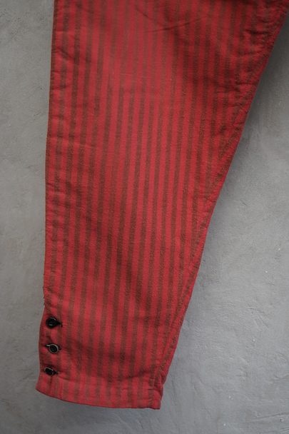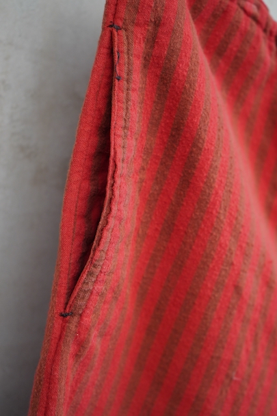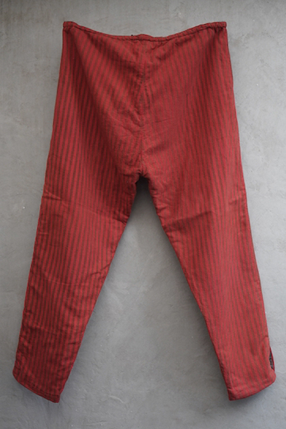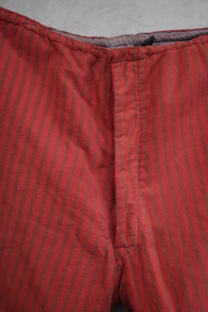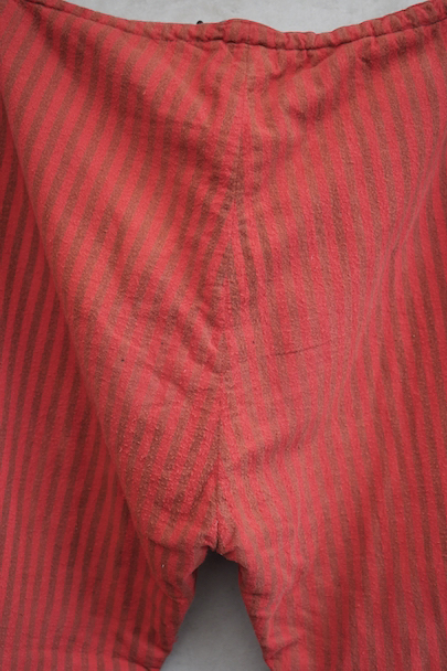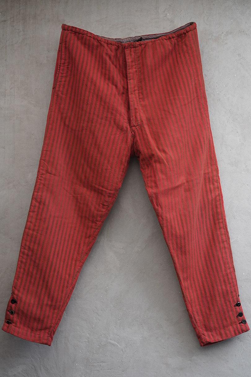 ストライプ柄の赤いパンツ。舞台衣装で、1920年代頃のものだと思います。柔らかいコットン素材、裏地が全体に張られています。フロントはボタンフライ、ウエストはドローコードで絞れるフリーサイズになっています。テーパードしたシルエット、裾はボタン留めになっています。右サイドにポケットがついています。全体的に毛羽立ちなどは見られますが、大きなダメージはなく状態は良好です。