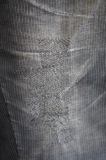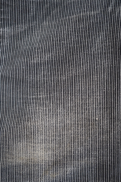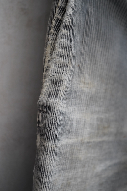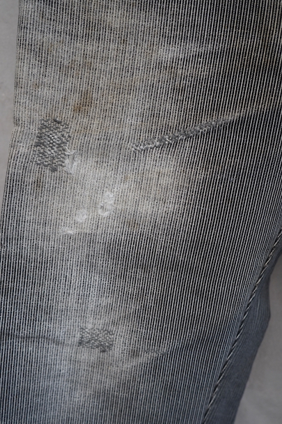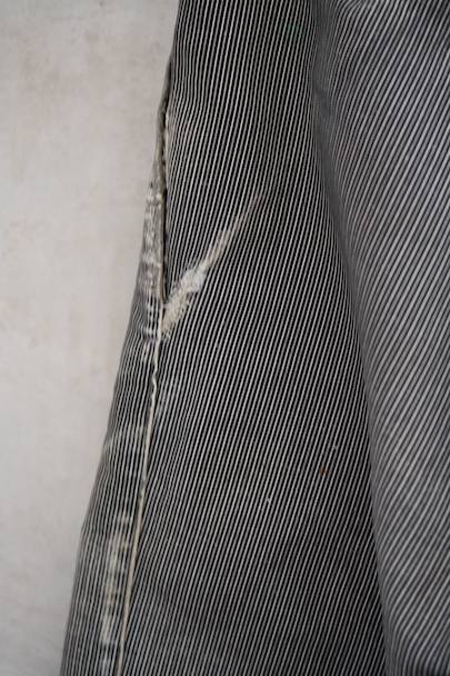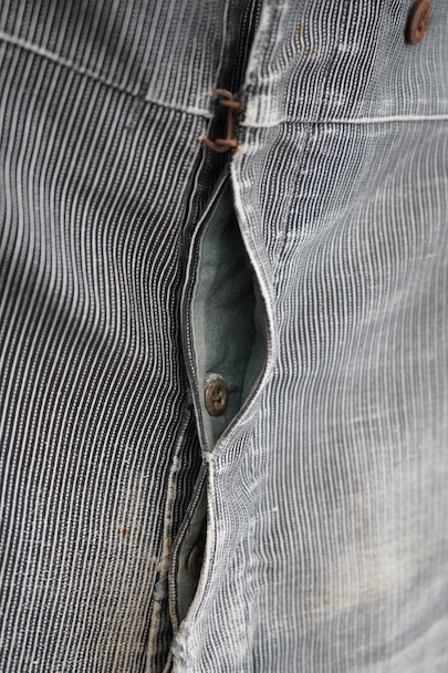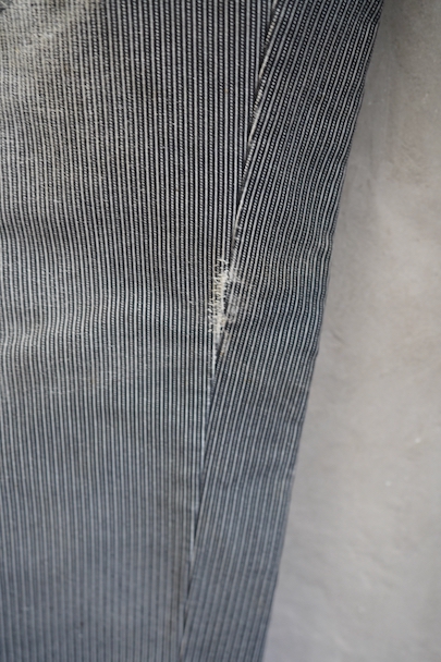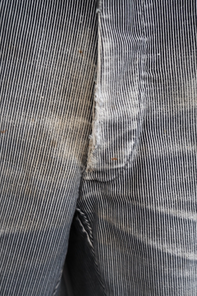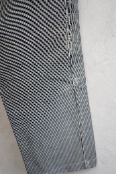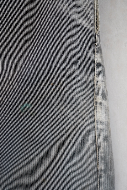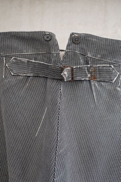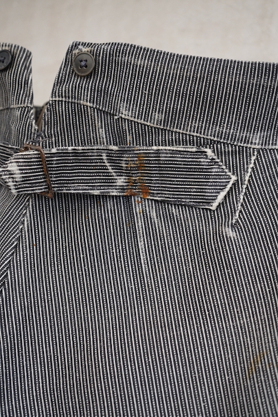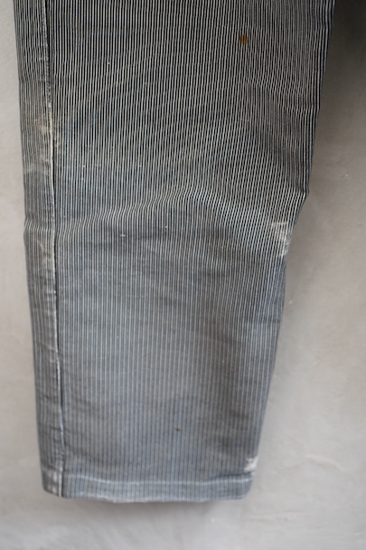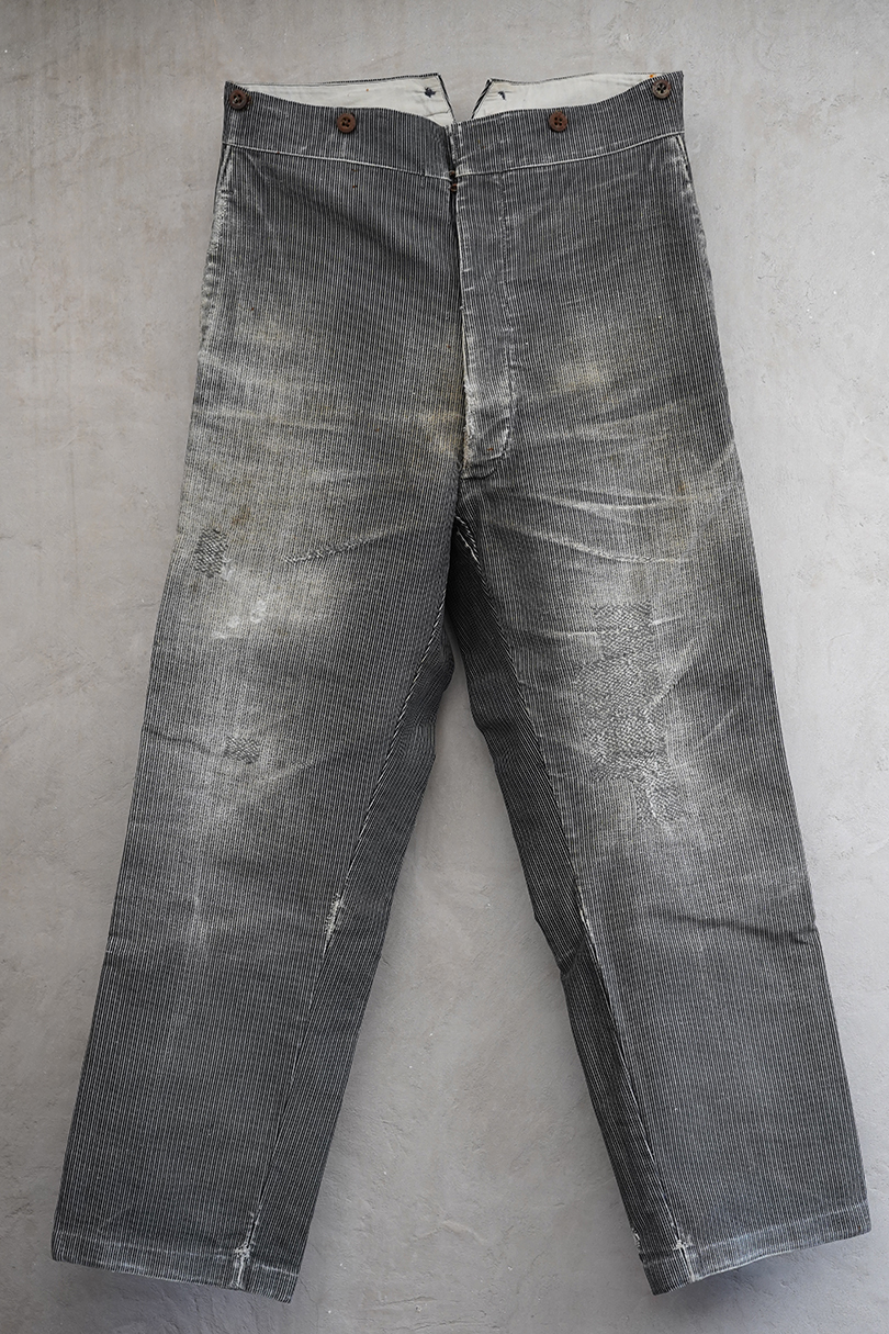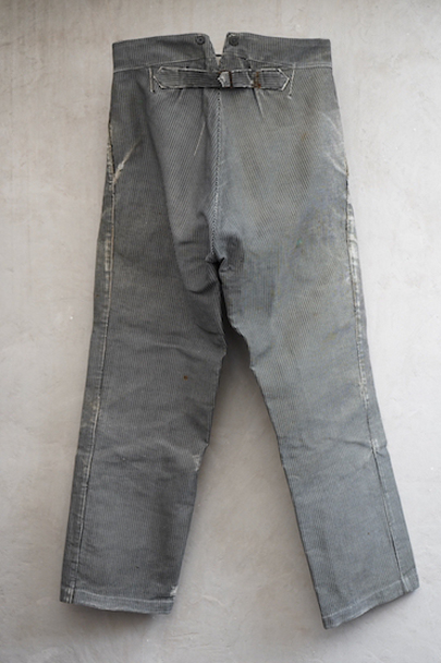 1940年代頃につくられたストライプ柄プリントのモールスキンが使われたワークパンツ。フロントはボタンフライ、ウエストラインにサスペンダー用ボタン、バックシンチ。ボタンはいくつかつけ替わっていますが、オリジナルはメタル・ボタンのようです。全体的に擦れや穴、直し痕が多く見られます。多少のシミもあります。