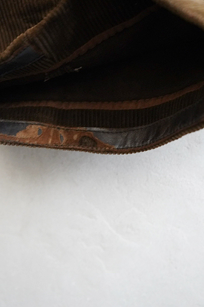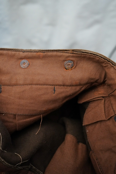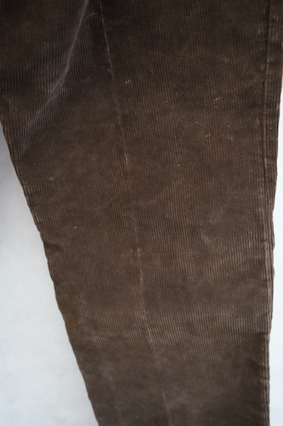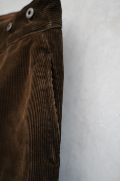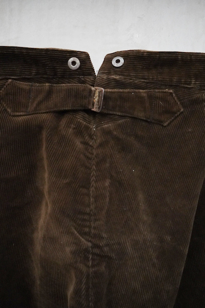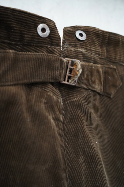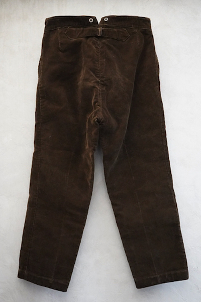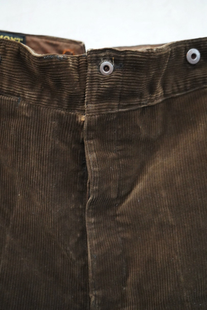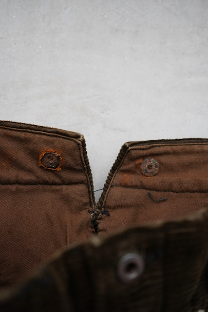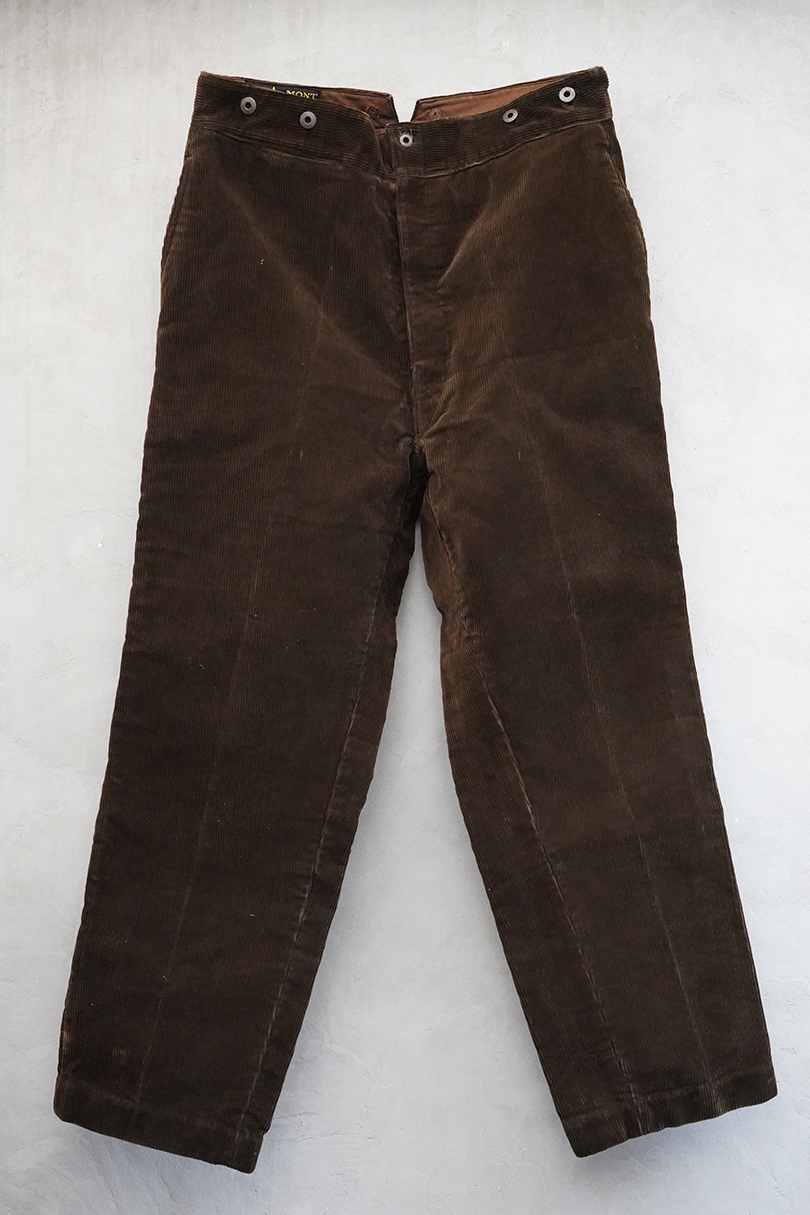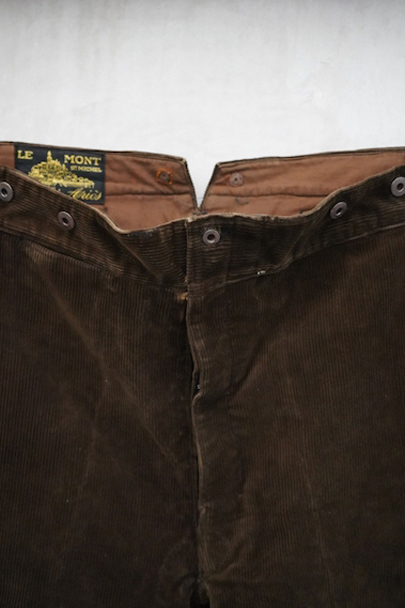1930年代から1940年代頃につくられたブラウン・コーデュロイのワークパンツ。"Le Mont St Michel"のもの、刺繍タグがついています。比較的しっかりとした布地です。フロントはボタンフライ、ウエストラインにはサスペンダー用ボタン、バックシンチ。ボタンは打ち込みのメタル製です。裾の内側にはレザーテープの補強があります。使用感は少ないのですが、ボタンやフックなどの金具にかなりの錆があり、裏地に錆による劣化で穴があります。センター部分などに多少のアタリが見られます。