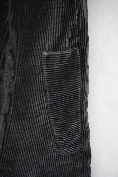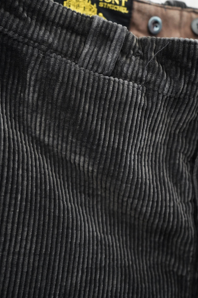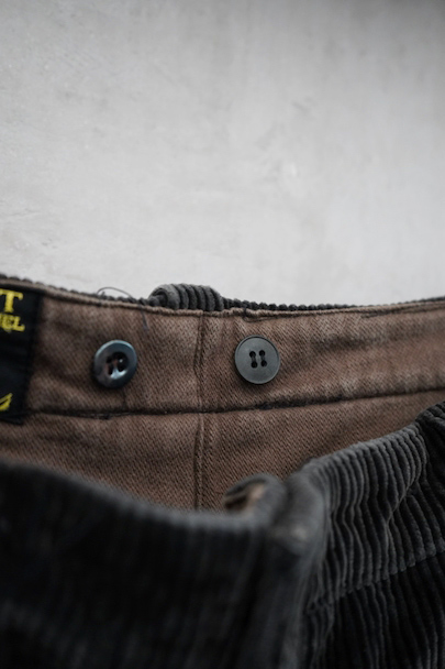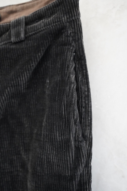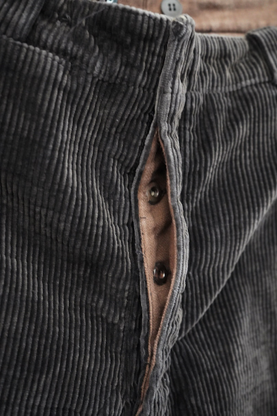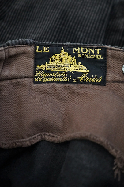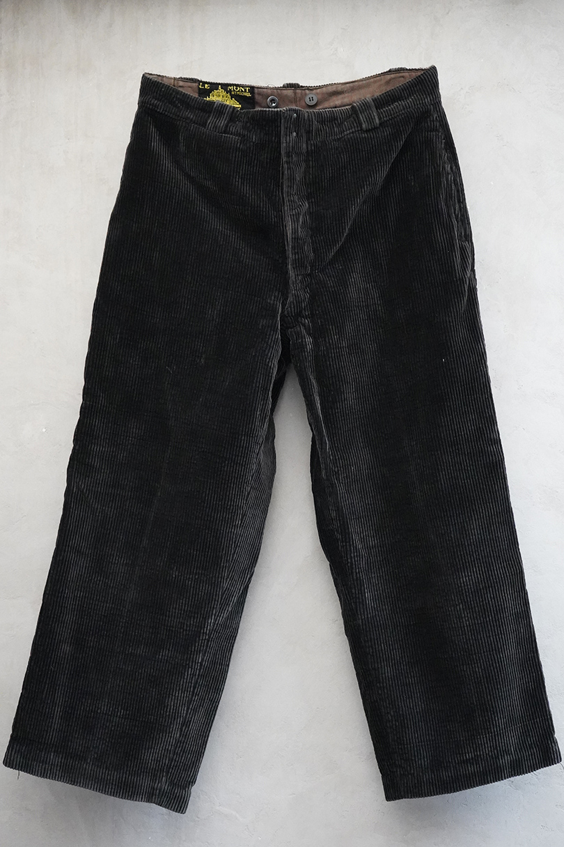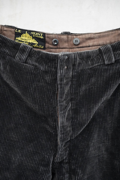 1940年代から1950年代頃につくられたチャコール・グレーの太畝コーデュロイのワークパンツ。"Le Mont St Michel"のもの、刺繍タグがついています。柔らかさのある布地、比較的裾まで太いシルエット。フロントはボタンフライ、ウエストラインにはベルトループ、内側にはサスペンダー用ボタンもついています。ボタンは様々なものにつけ替わっていますがメタル製のものが多いです。ポケットは左右とウオッチ・ポケット、右サイドにはツールポケットがついています。右腿後ろに小さい穴がありますが、全体的な状態は良いです。
