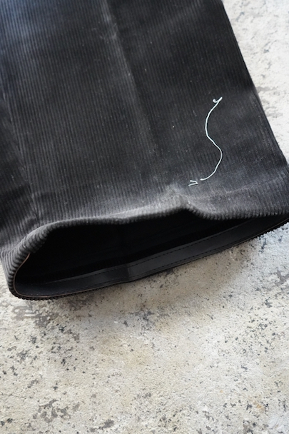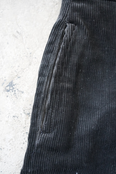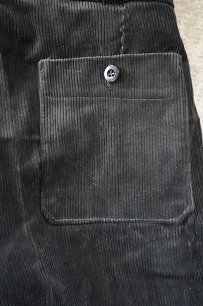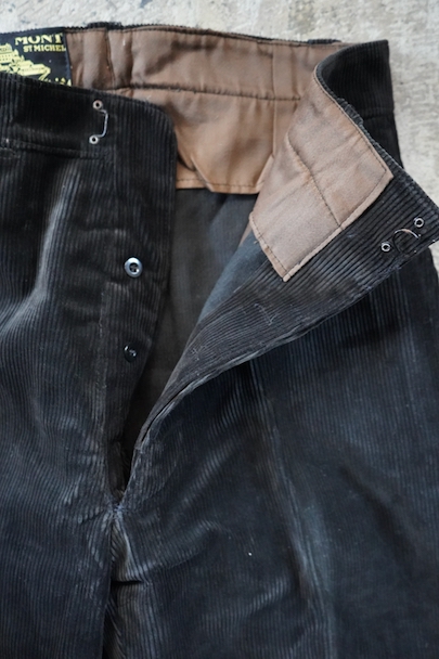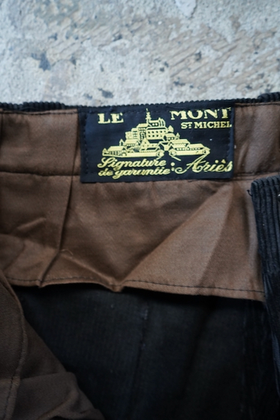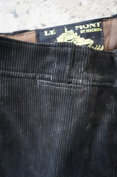 1940年代から1950年代頃につくられたブラック・コーデュロイのワークパンツ。"Le Mont St Michel"製、紙タグつきのデッドストックです。刺繍タグがついています。フロントはボタンフライ、ウエストにはベルトループ。ポケットは左右とウオッチ用、右ヒップにボタン留めのパッチポケット。裾の内側にレザー・テープの補強がついています。保管中についた多少の汚れはありますが、状態は良いです。初めて水通しする際に多少縮む可能性があります。