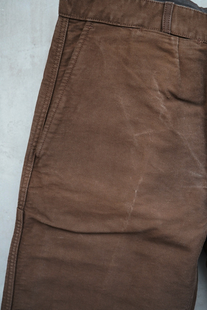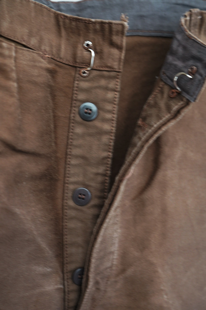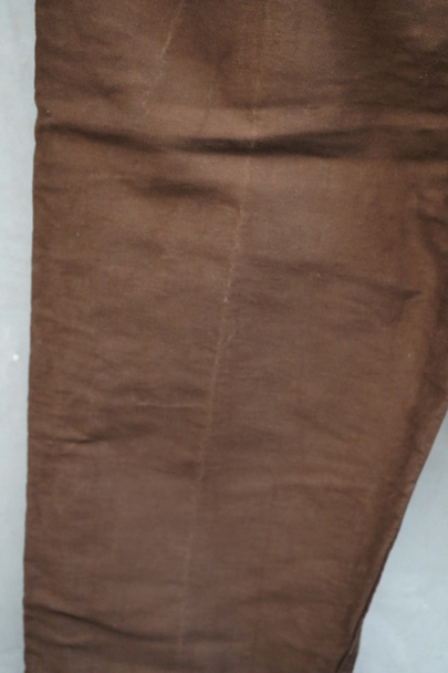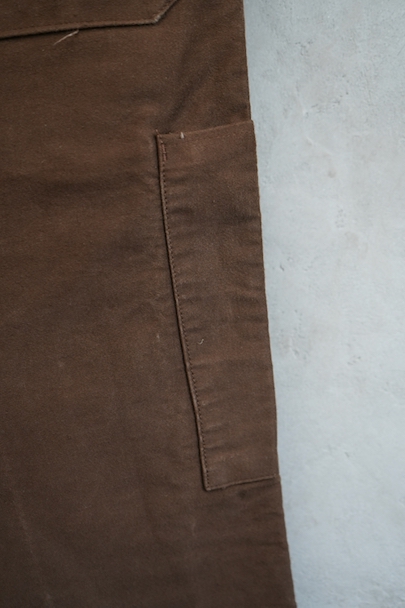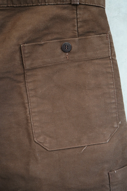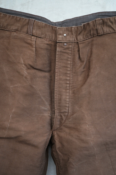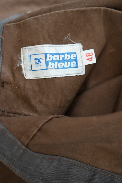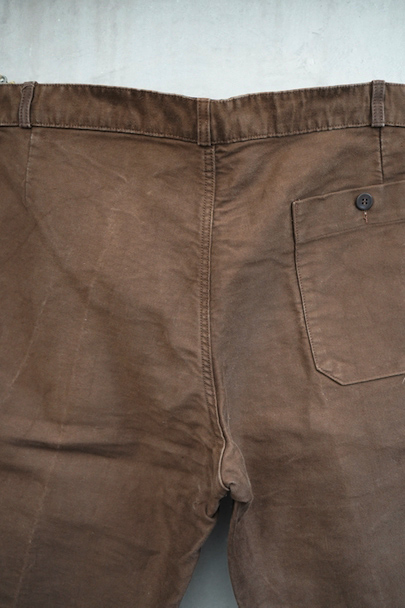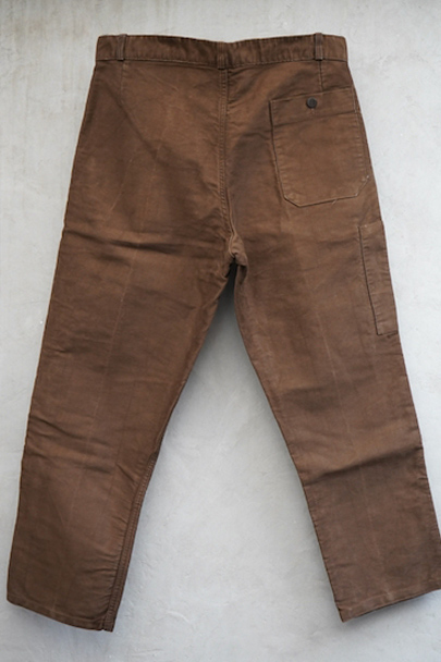 ブルーやブラックに比べて数の少ないブラウン・カラーのモールスキン・ワークパンツ。"barbe bleue"プリントタグがついています。1960年代から1970年代頃につくられたものだと思います。表記サイズは48。フロントはボタンフライ、ポケットは左右とウオッチ用、右ヒップにボタン留めのポケット、右サイドにツールポケット。未使用品を一度洗濯しています。多少のアタリはありますが、状態は良いです。