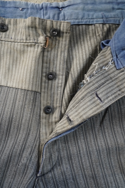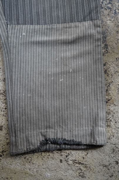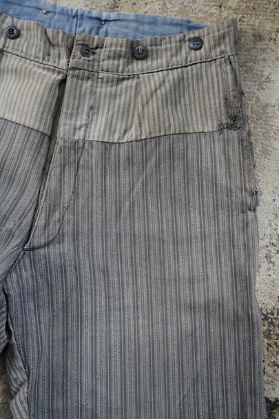 1950年代頃までにつくられたストライプ織柄コットンのワーク・パンツ。使い込まれてフロント部分に大きくにストライプ柄コットンの別布を接いだ直しがされています。 フロントはボタンフライ、ウエストラインにサスペンダー用ボタン、バックシンチ。ボタンは様々なものにつけ替わっています。擦れやほつれ、穴、直し痕、シミなどの使用感があります。