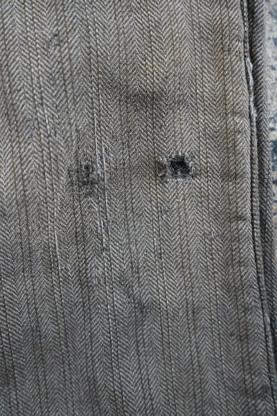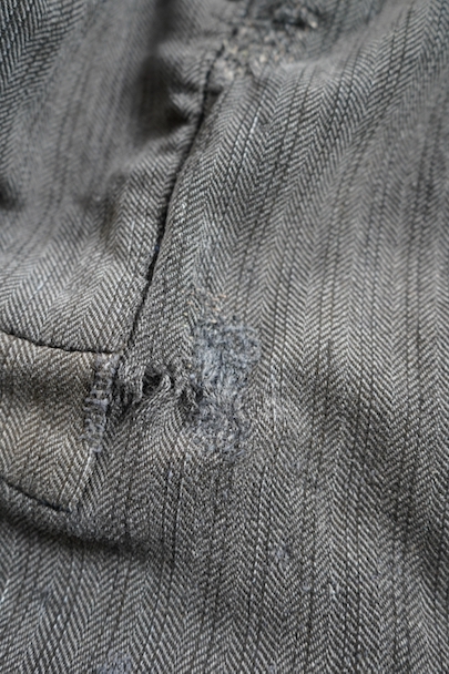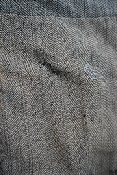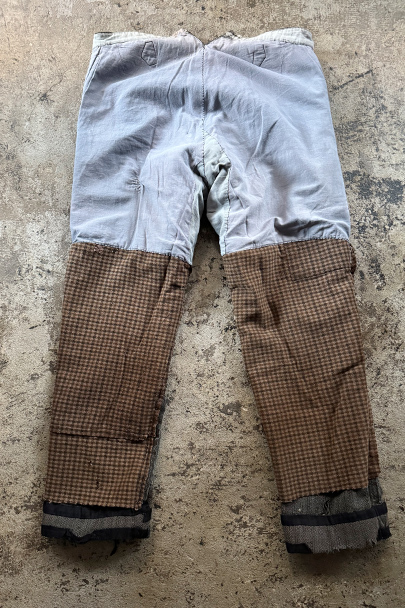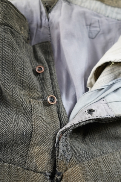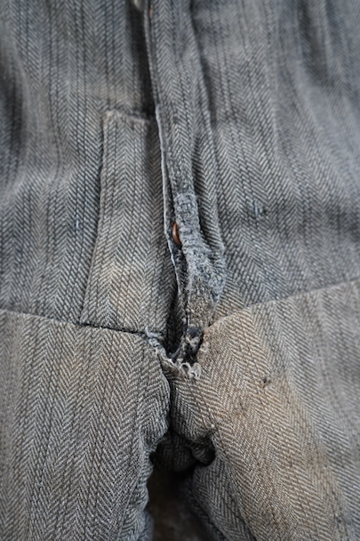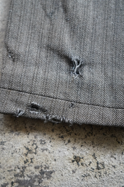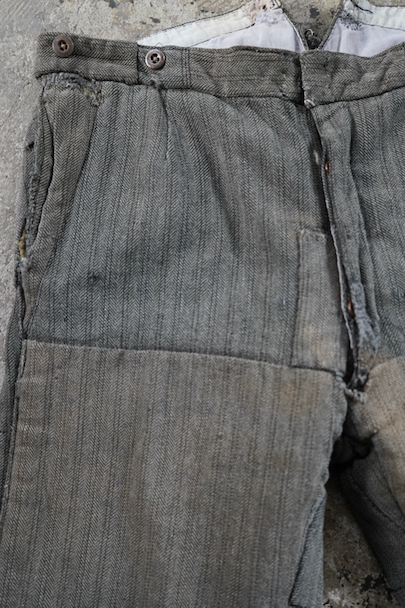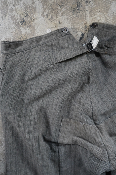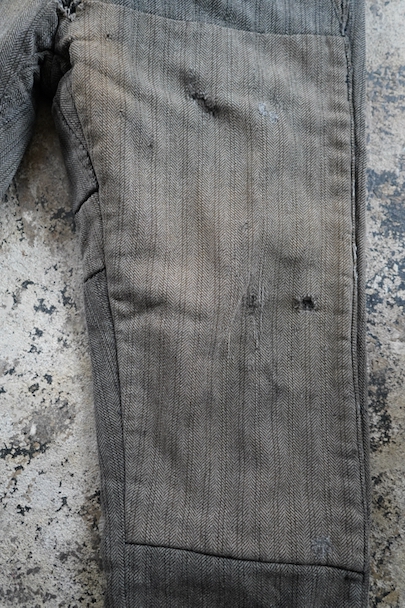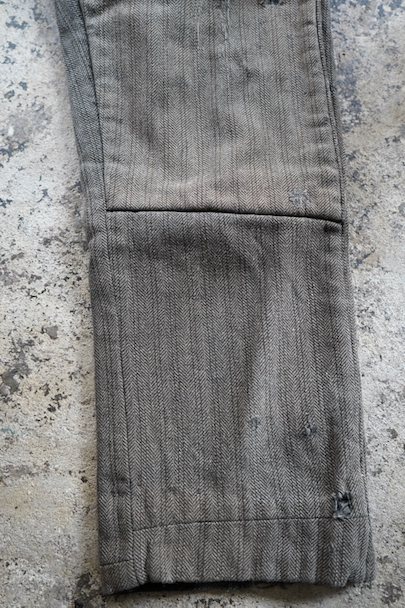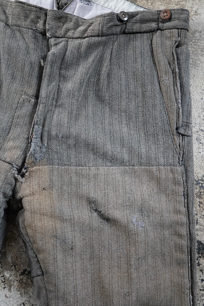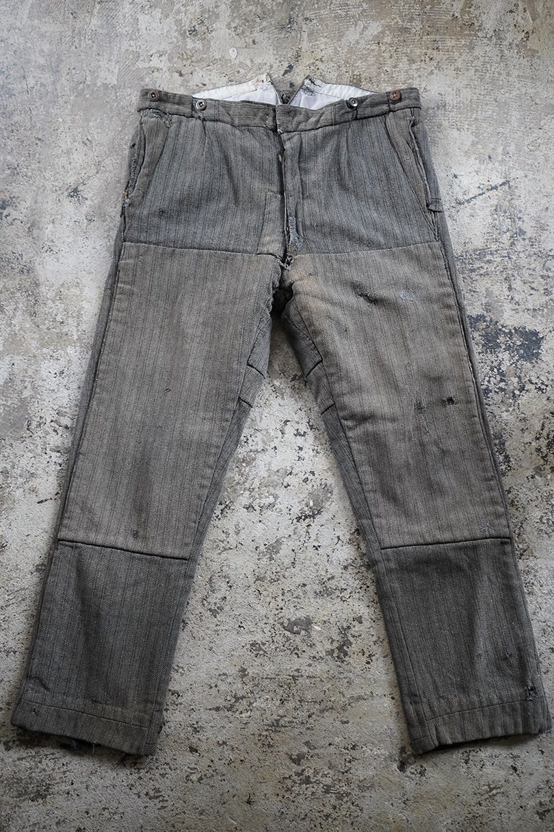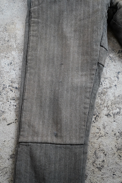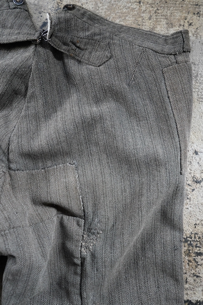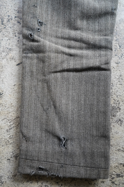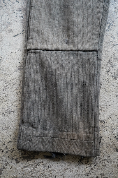 1940年代頃までにつくられたストライプ織柄ウールのワーク・パンツ。使い込まれて共布を接いだ直しがされていますが、少し色の違いがあるため良い表情になっています。 フロントはボタンフライ、ウエストラインにサスペンダー用ボタン、バックシンチ。ボタンは様々なものにつけ替わっています。全体ではないですが、多くの部分に裏地がつけられています。裾近くに穴が多くあり、擦れやシミなどの使用感があります。ダメージを気にされない方にお勧めします。