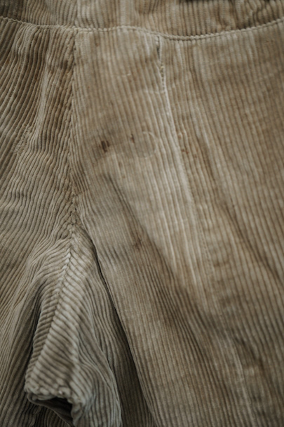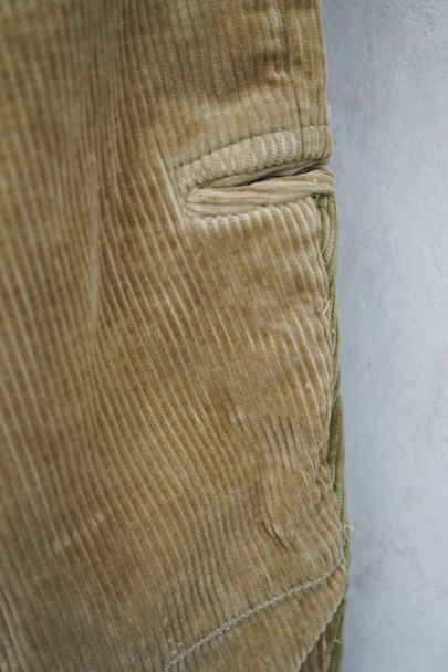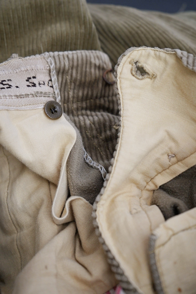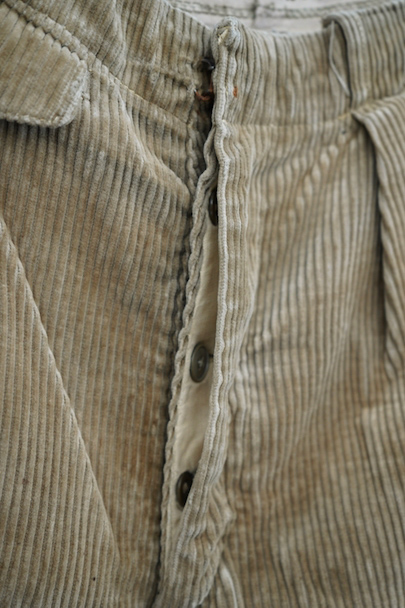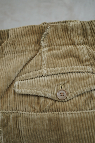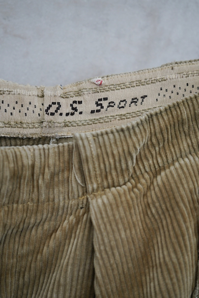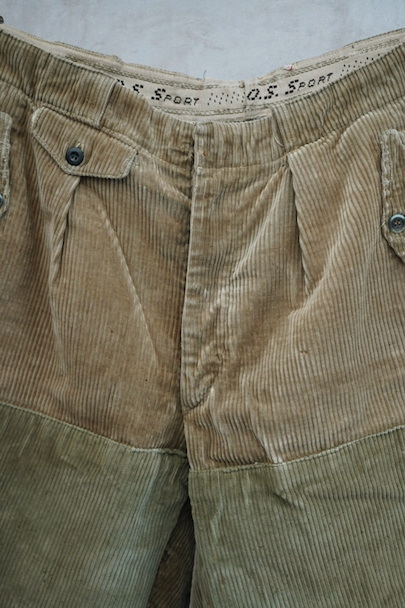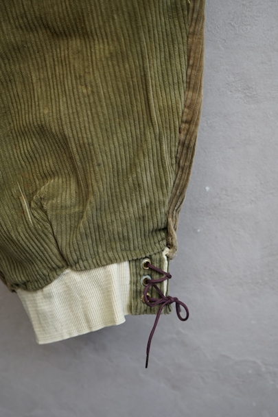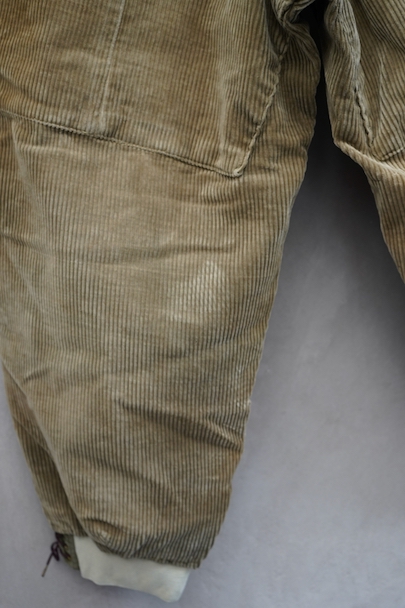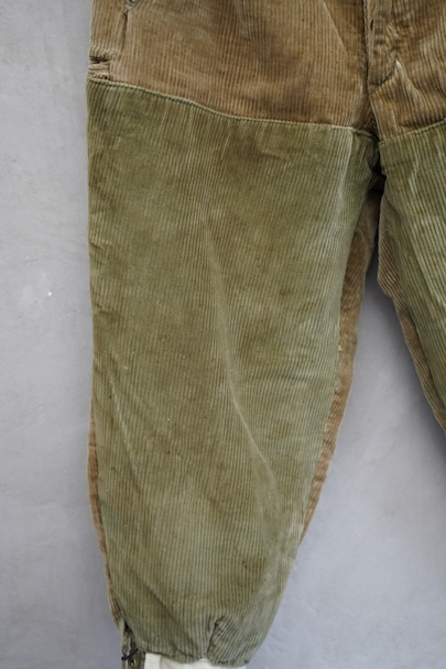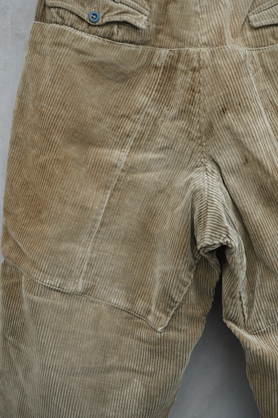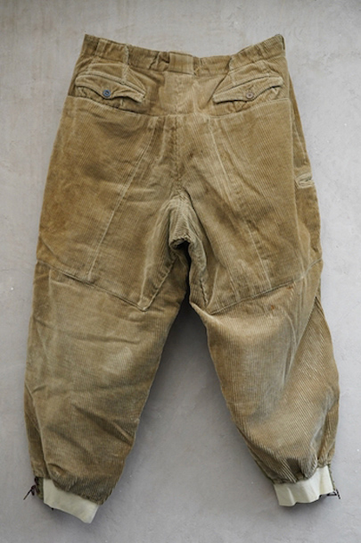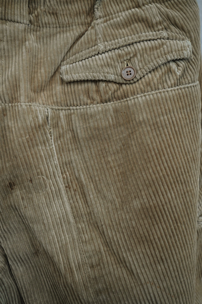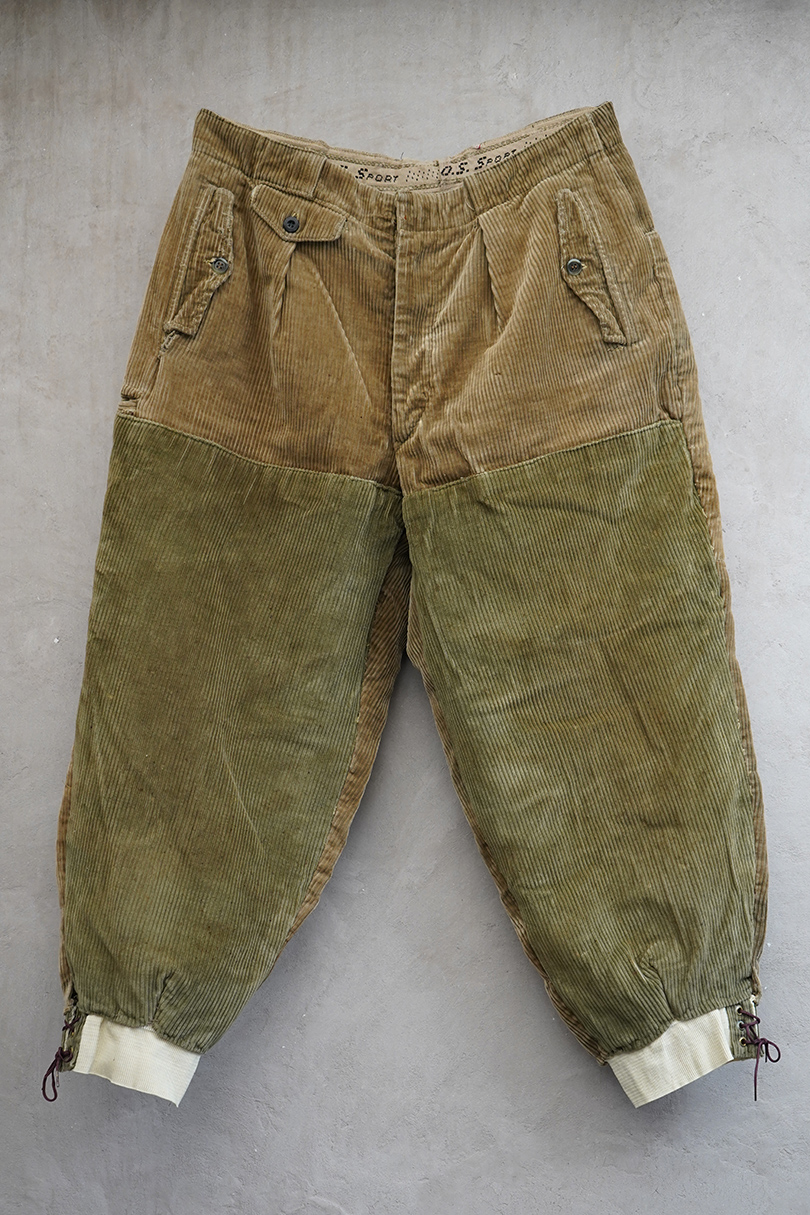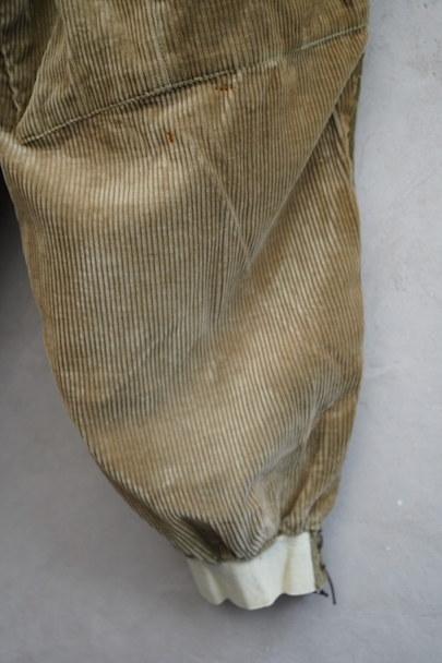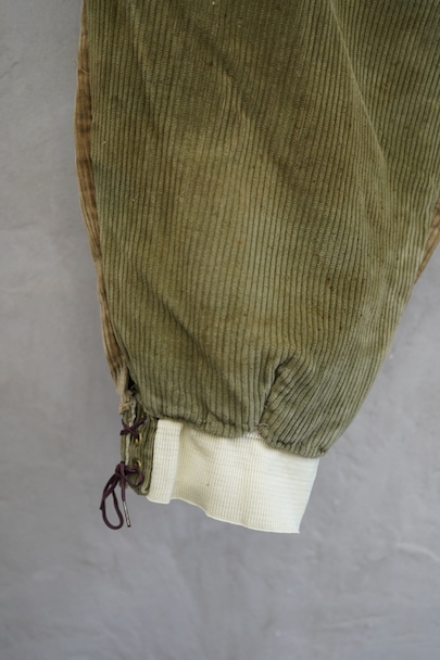 1940年頃につくられたライト・ブラウンのコーデュロイ素材のスポーツ・パンツ。ポケットはサイドを除き全てがボタン留めフラップ・ポケット、広い渡り幅、細くなった裾にはゴムが使われ、さらにウエストにはベルトループ、フロントはボタンフライ、レースアップになっています。フロントは少し緑がかったコーデュロイの布が当てられ、ヒップ部分も2枚布になっています。全体的に小さいシミ、多少の直し痕や擦れ、ほつれがあるなどの経年の使用感があります。金具にサビ、ボタンは様々なものにつけ替わっています。