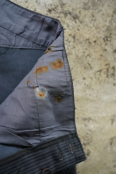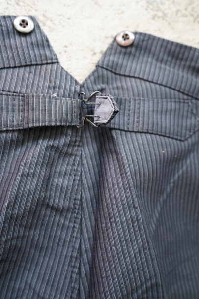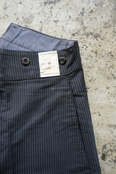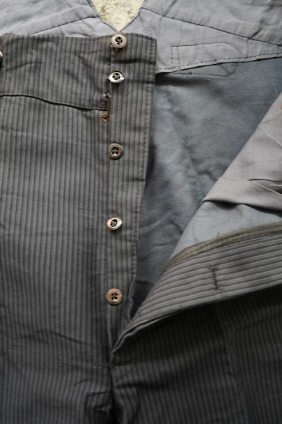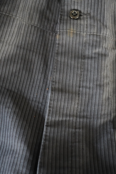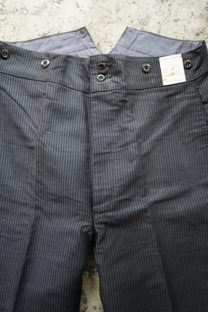 1940年頃までにつくられたストライプ柄プリントのモールスキン・ワークパンツ。デッドストックです。フロント・トップが2連ボタン留め、ボタンフライ、ウエストラインにサスペンダー用ボタン、バックシンチ。紙タグの表記サイズは44です。フロントのホックやボタンにサビがあり、ホック周辺などにサビ汚れ、内側にサビ染みと穴があります。その他、シミや少し色焼けがあります。