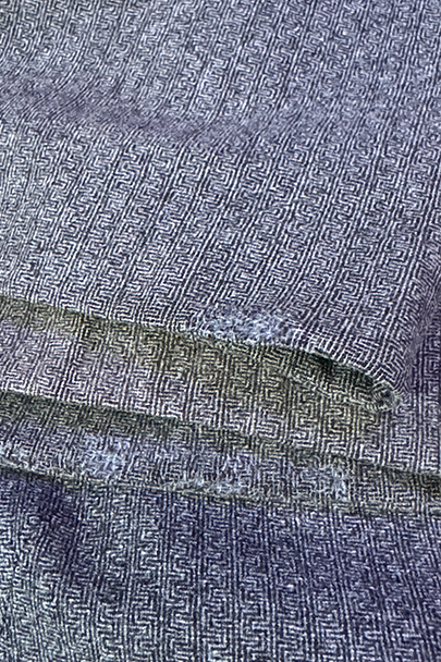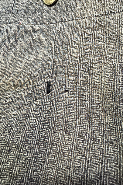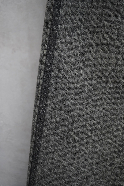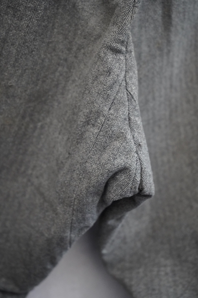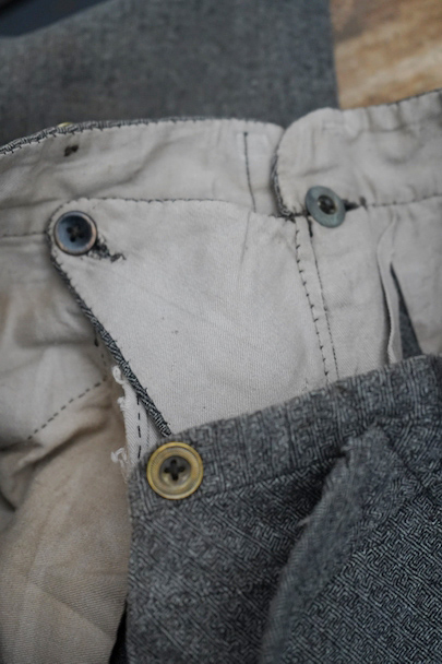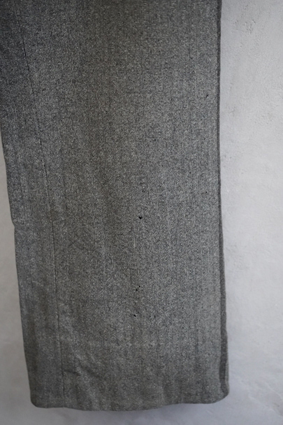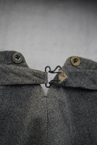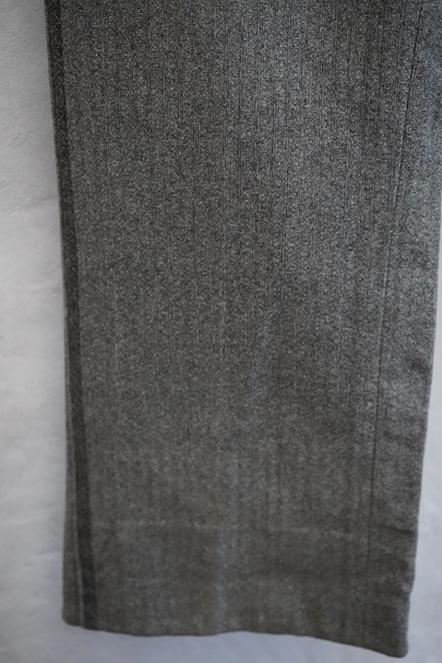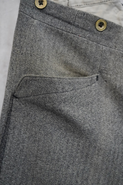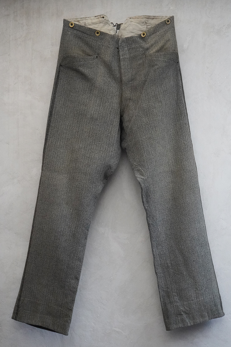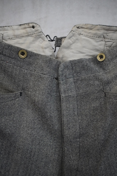 20世紀初期頃までにつくられたパンツ。珍しい織り柄の入ったグレーのウール素材、細めの綺麗なシルエット、バックが高くなったウエストライン、前立ての形状やポケットの形が良い魅力的な品です。サイドに織りによるラインが入っています。ボタンはメタル製(一部ボーン製)、ボタンホールは手縫い。フロントはボタンフライ、バックシンチでウエストの調節ができます。多少の色焼け、小さい穴、裾に直し痕などがありますが、年代と素材を考えるとかなり状態は良いです。