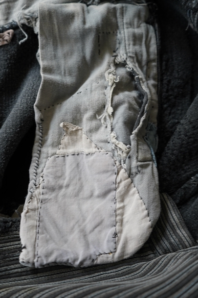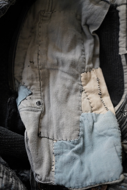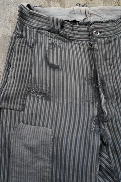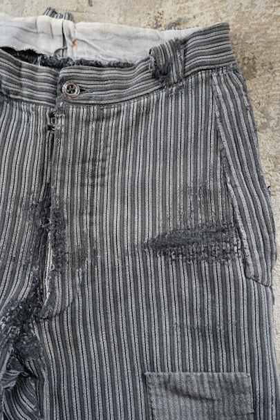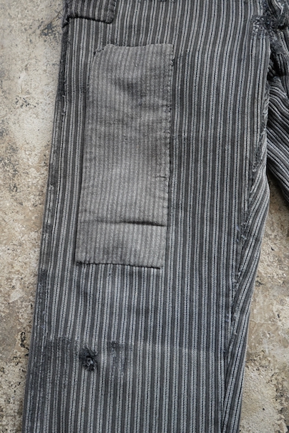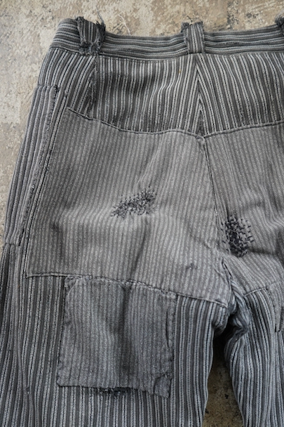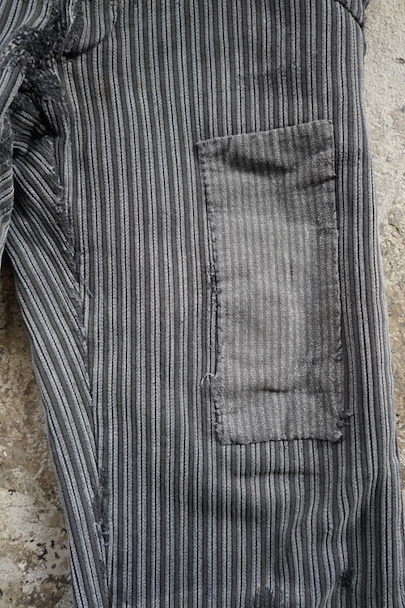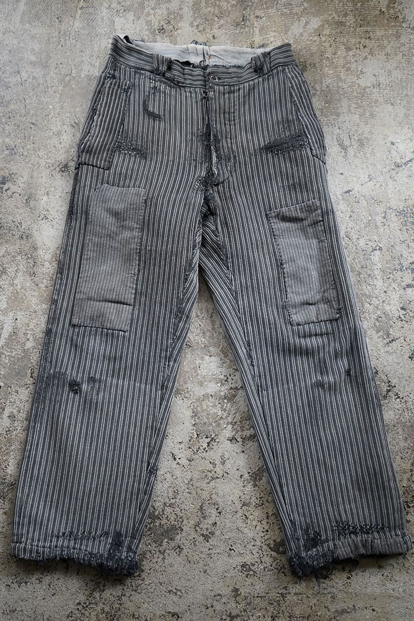 1940年代頃までにつくられたワーク・パンツ。グレーのコットン・ピケ素材、かなり使い込まれて、共布やストライプ柄のコットンの別布がパッチされた直しやダーニングの直しが多くされた様子が味わいのある品です。フロントはボタンフライ、ウエストにベルトループ。擦れや穴、ほつれなどがあります。着用可能な状態ですが、直しながらご愛用できる方にお勧めします。