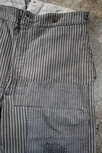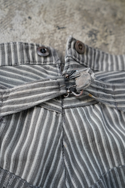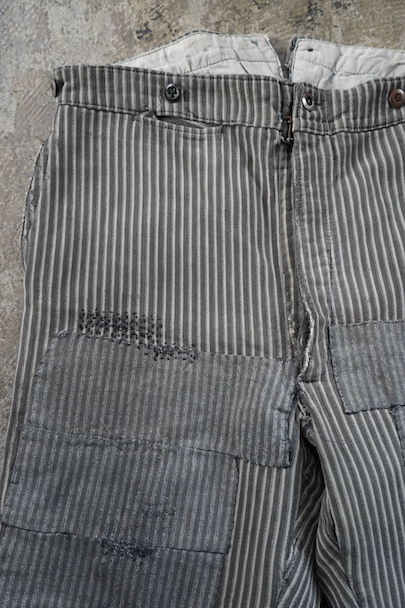 1940年代頃までにつくられたワーク・パンツ。グレーのストライプ織柄コットンの風合いの良い布地。かなり使い込まれて、ストライプ柄のコットンの別布がパッチされた直しやダーニングの直しが多くされた味わいのある品です。フロントはボタンフライ、ウエストにウエストラインにサスペンダー用ボタン、バックシンチ。メタル・ボタンがついています。擦れやほつれ、シミがある等、使用感があります。