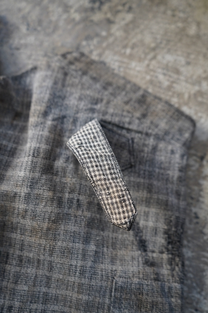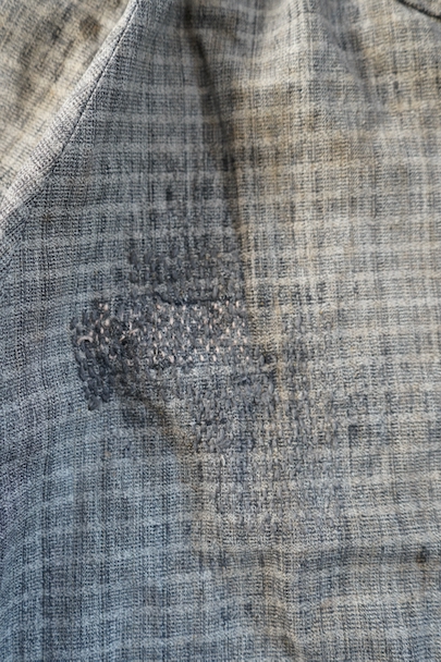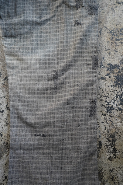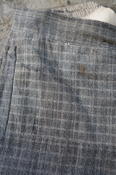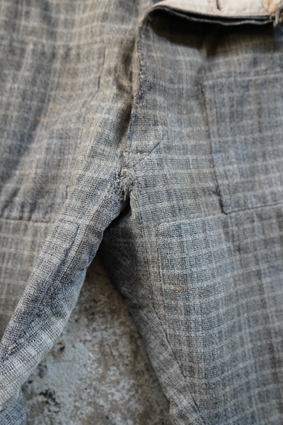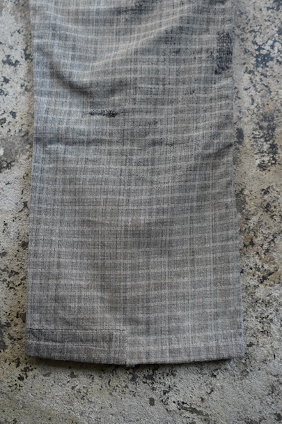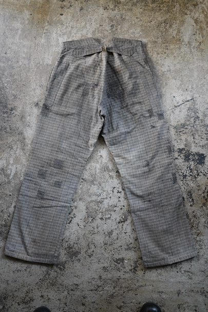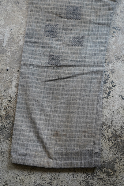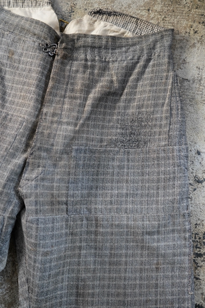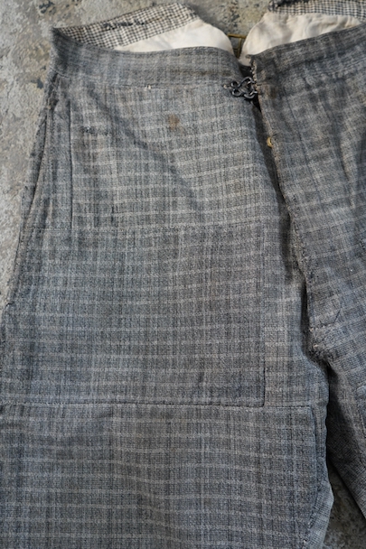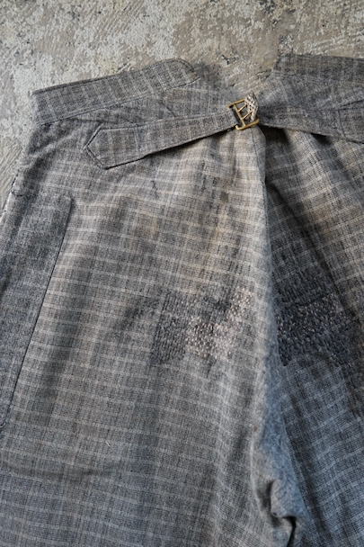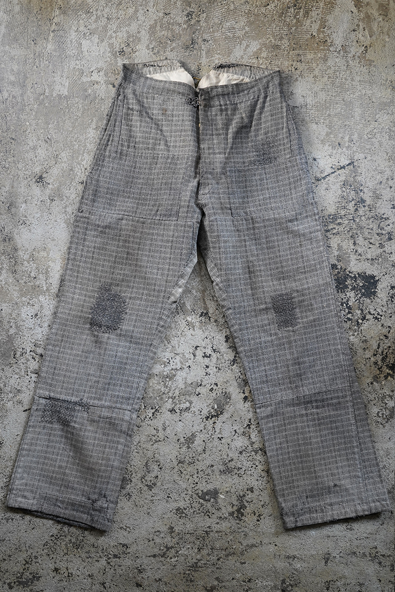 20世紀初期頃までにつくられた珍しいグレーのチェック織柄のコットン素材のパンツ。フロントはボタンフライ、バックチンチがついています。フロント部分は2枚布になっており、ダーニングや共布を接いだ直しがされています。全体的にシミや擦れ、直しがあるなどの使用感がありますが、着用に問題ない程度です。