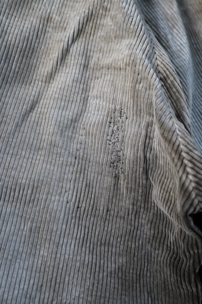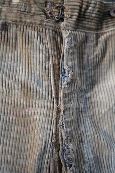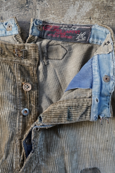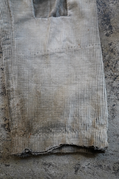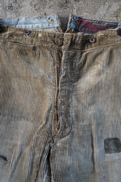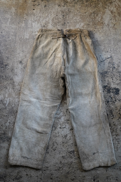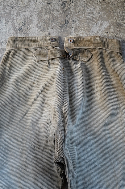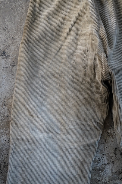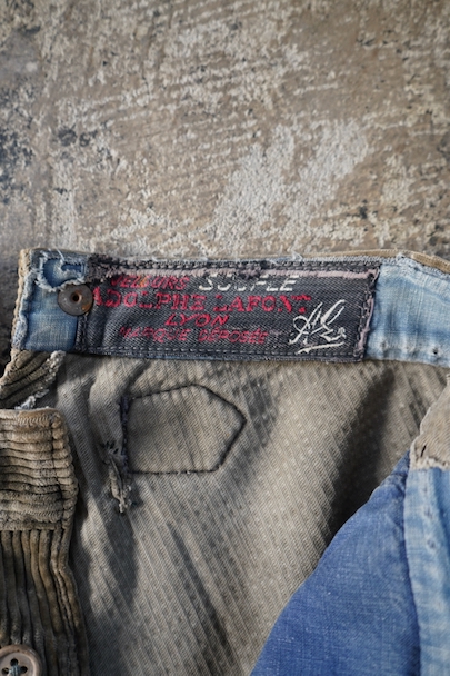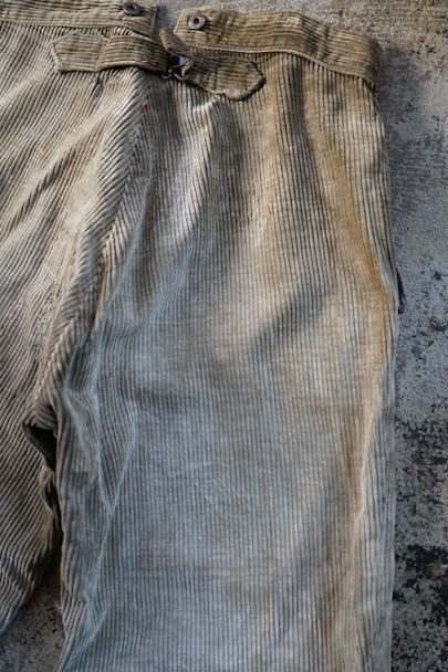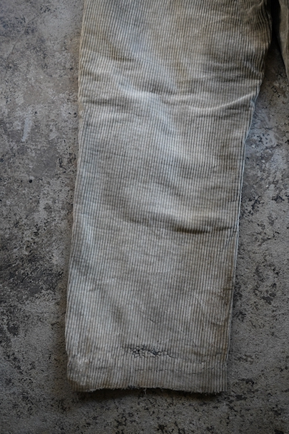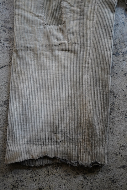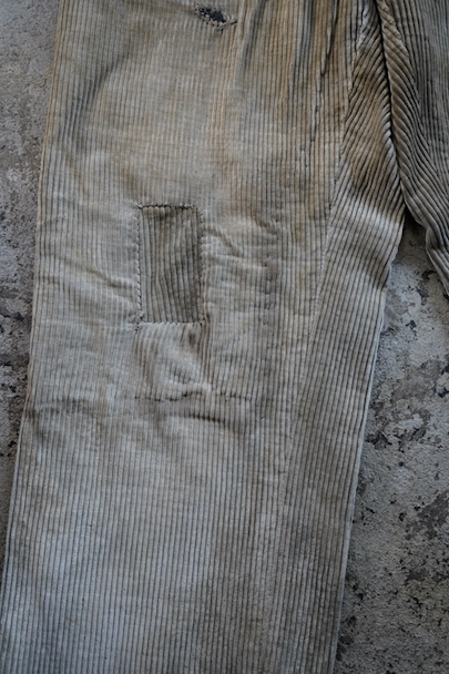 1940年代頃までにつくられたコーデュロイのワークパンツ。リヨンの老舗ワークウエア・メーカー"Adolphe Lafont"のもの。褪色してベージュになったコーデュロイ。所々、布を接いだ直しがされています。手縫いの直し痕も見られます。裾部分は削れて擦り切れています。フロントはボタンフライ、ウエストラインにサスペンダー用ボタン、バックシンチ。擦れや穴、ボタンなど金具に錆、シミがある等、使用感がありますが、着用に問題ない程度です。