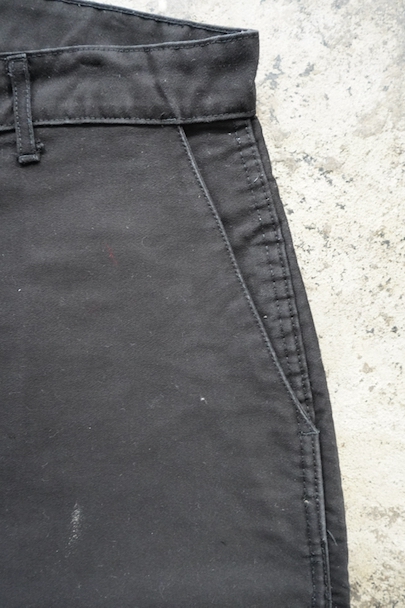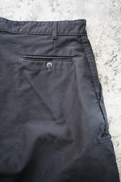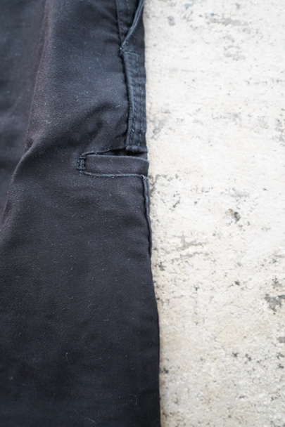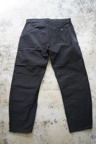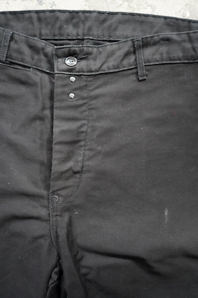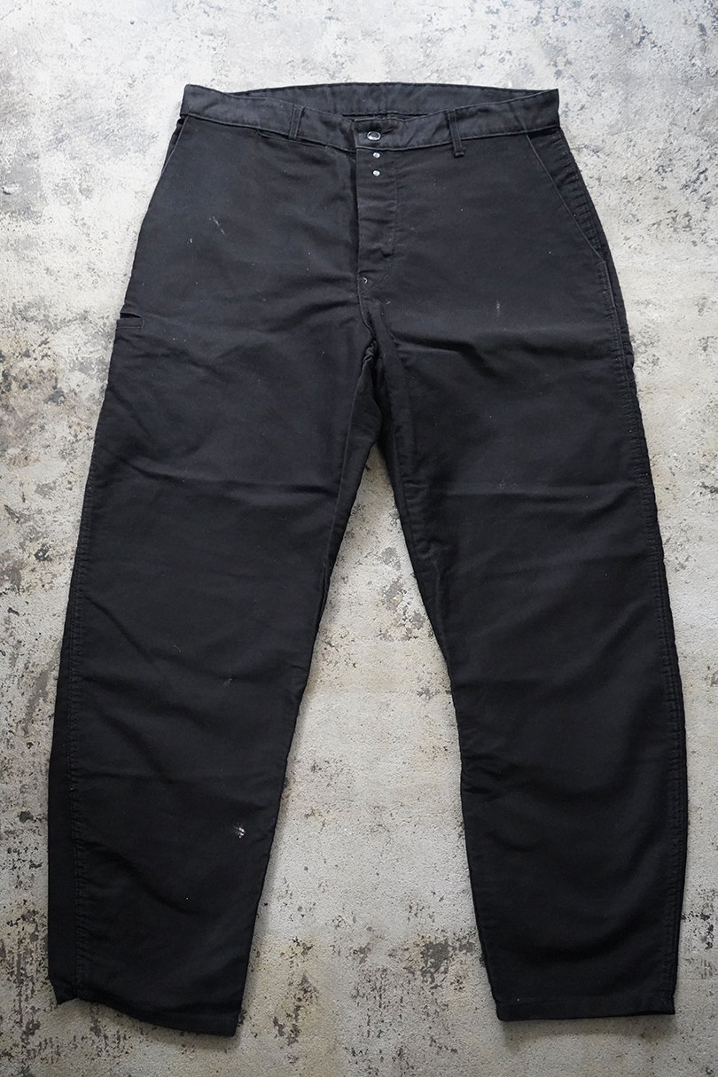 ブラック・モールスキンのワーク・パンツ。1960年代頃につくら得れたものだと思います。広めのワタリで裾に向かって細くなるシルエット。フロントはボタンフライ、ウエストラインにベルトループ。ポケットは左右とウオッチ用、右ヒップにボタン留めポケット、右サイドにツールポケット。所々白い塗料のような汚れがあります。使用感はありますが大きなダメージは無く状態は良好です。