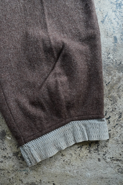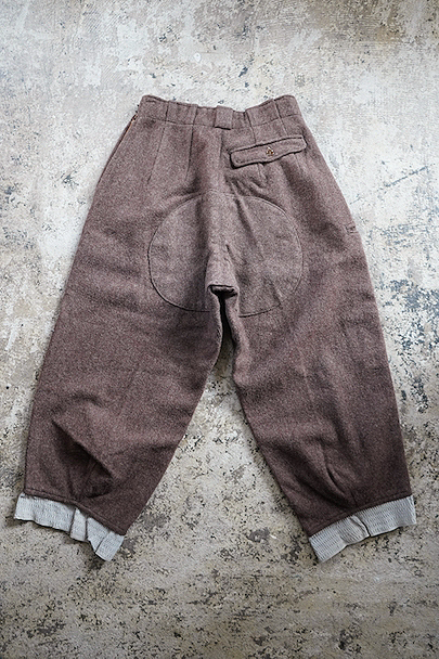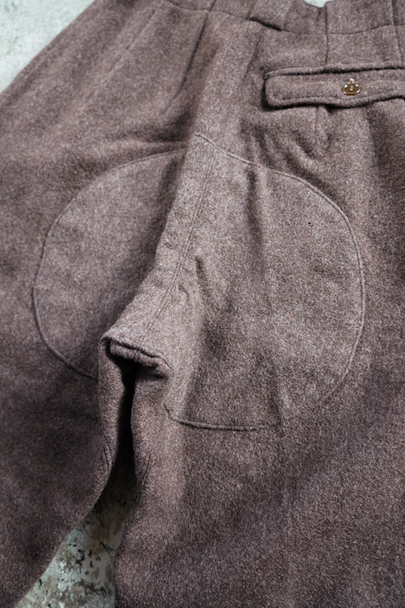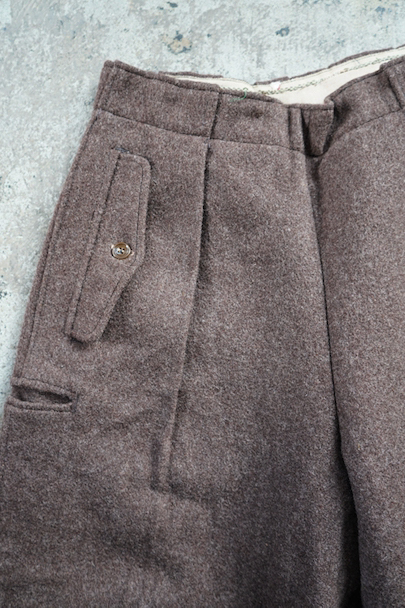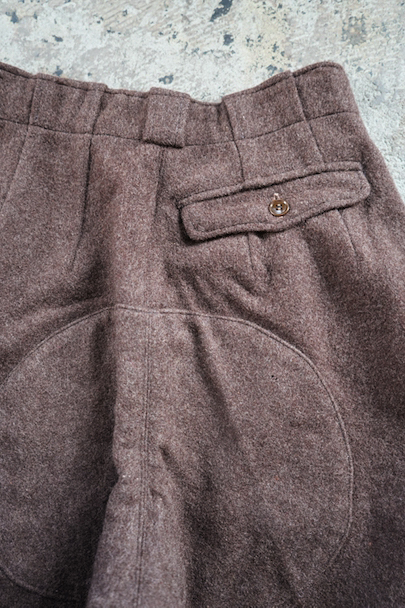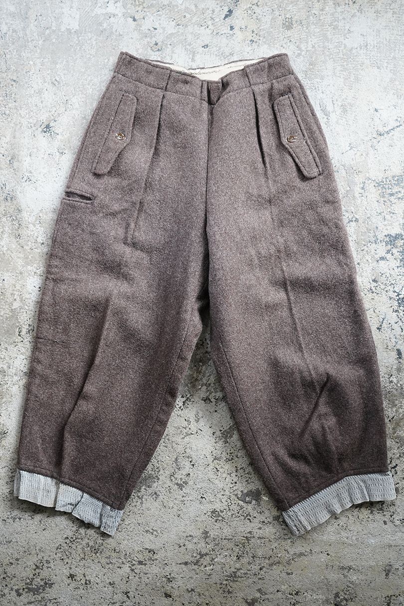 1940年から1950年代頃につくられたニッカーズタイプの女性用スポーツパンツ。左右と右ヒップにボタン留めのフラップがついたポケットが配され、右サイドには細長いポケットがあります。左サイドをファスナーで開閉します。ブラウン系の霜降りウール素材、裾はゴムの入った別素材ですが、ゴムは伸び切っています。ウエストにはベルトループ。小さな穴が見られますが、大きなダメージは無く、状態は良いです。