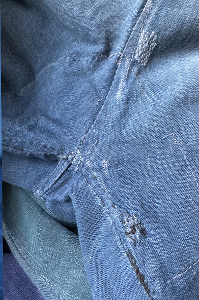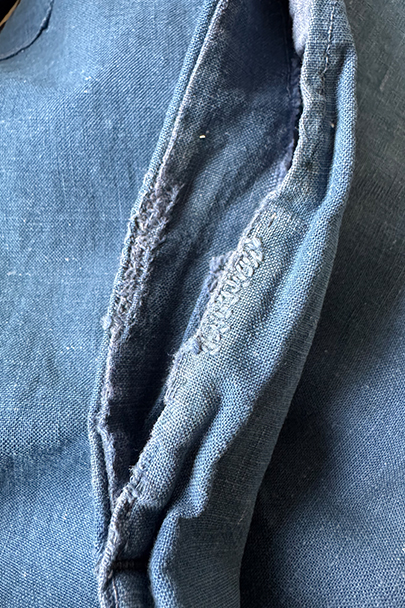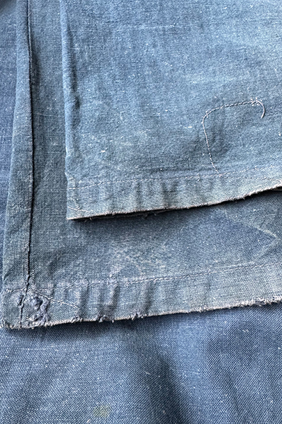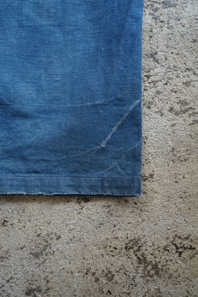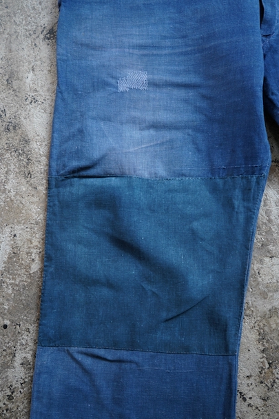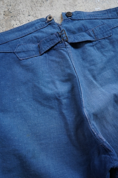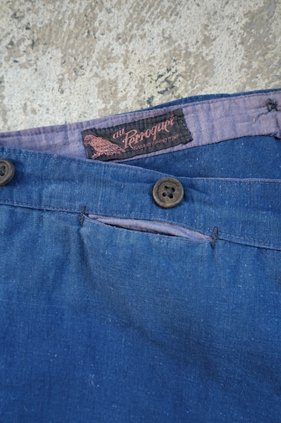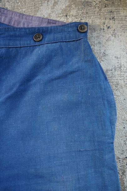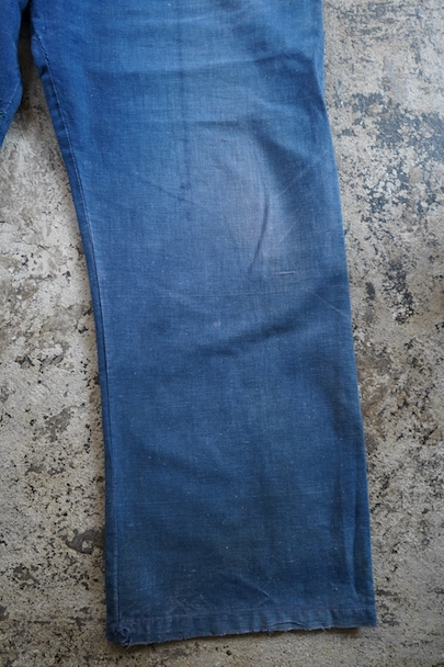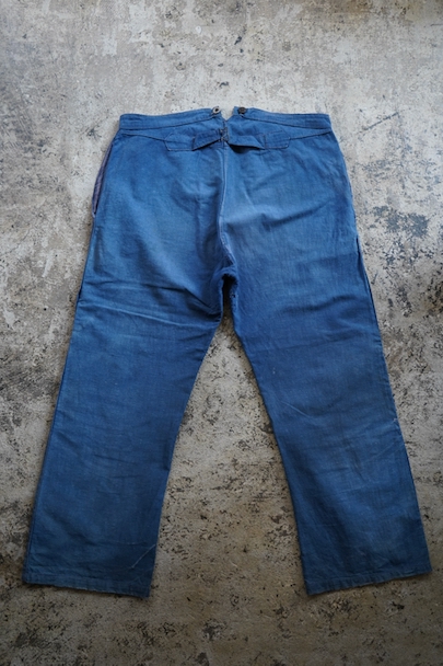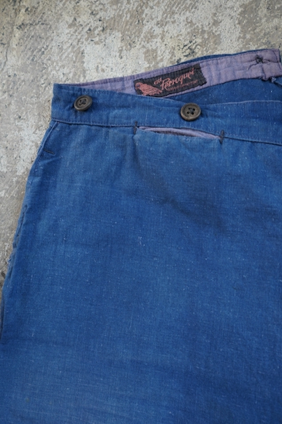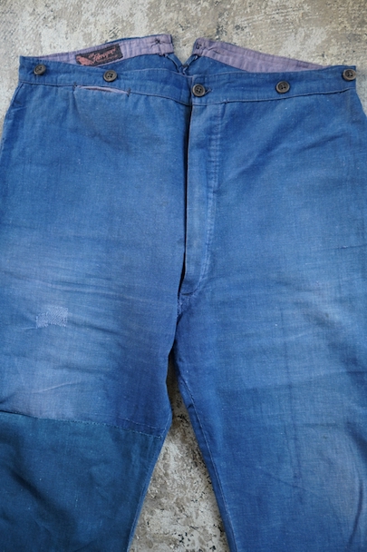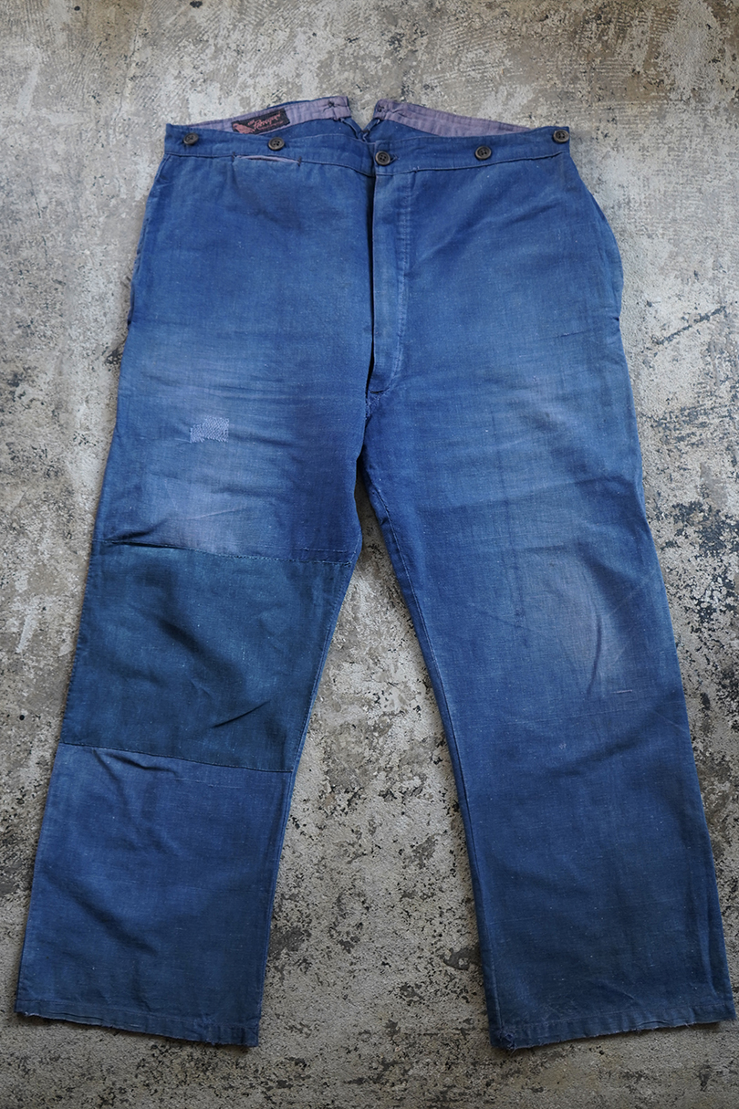 1940年代頃につくられたワークパンツ。インディゴ染めのリネン・コットン素材、比較的薄手の布地です。"au Perroquet"織りタグが付いています。ウエストラインにサスペンダーようボタン、バックシンチ、フロントはボタンフライ。風合いの良いウッド・ボタンが使われています(1つパピエマシェのものにつけ替わっています)。右膝に布を接いだ直し、その上部にダーニングの直し痕があります。前立て下方や股部分、ヒップ下方、右ポケットに手縫いの直し痕、小さい穴やシミ、擦れがあるなどの使用感があります。