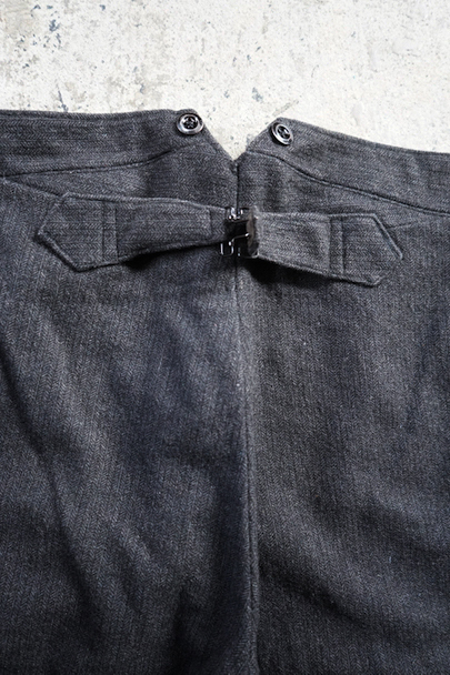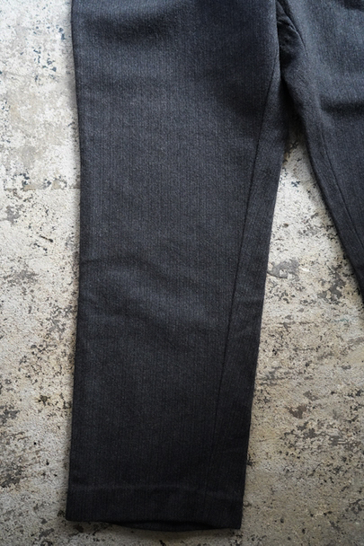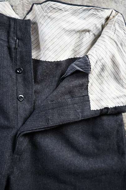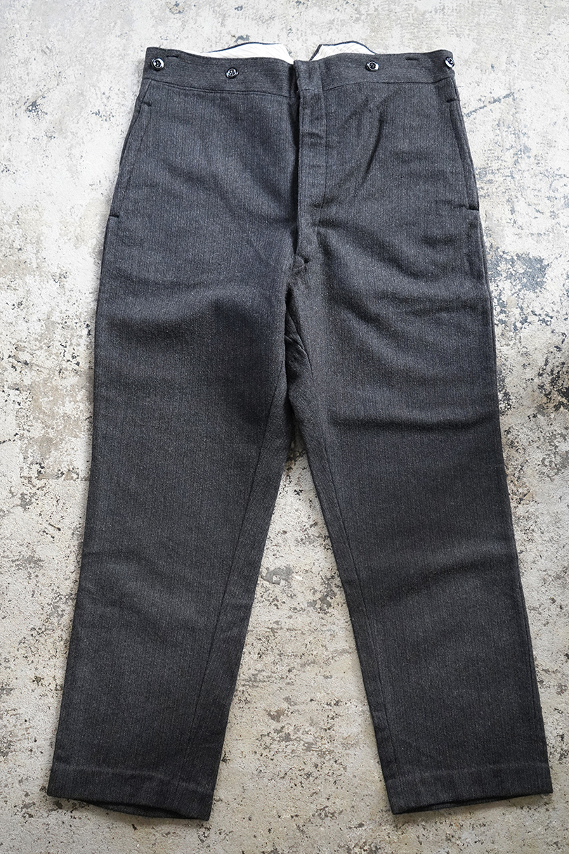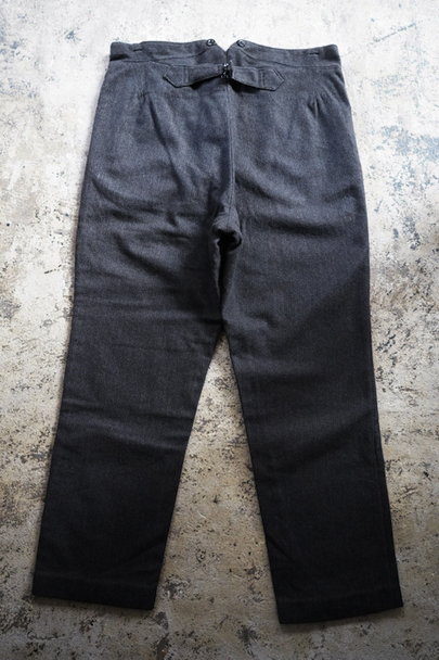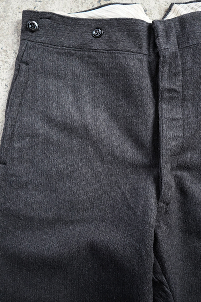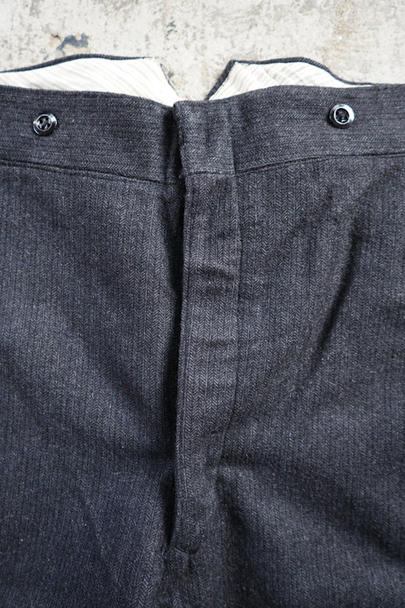 1940年代頃までにつくられたヘリンボーン織りのウールパンツ。フロント・トップはフック留め、ボタンフライ、ウエストラインにサスペンダー用ボタン、バックシンチがついています。ボタンはメタルボタン。使用感は少なく状態は良いです。
