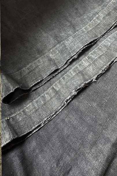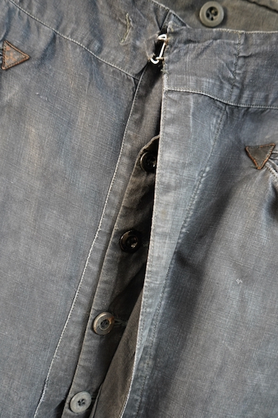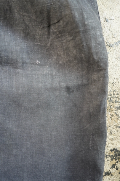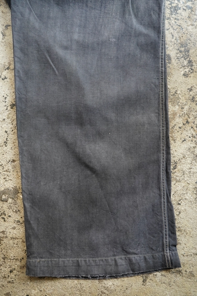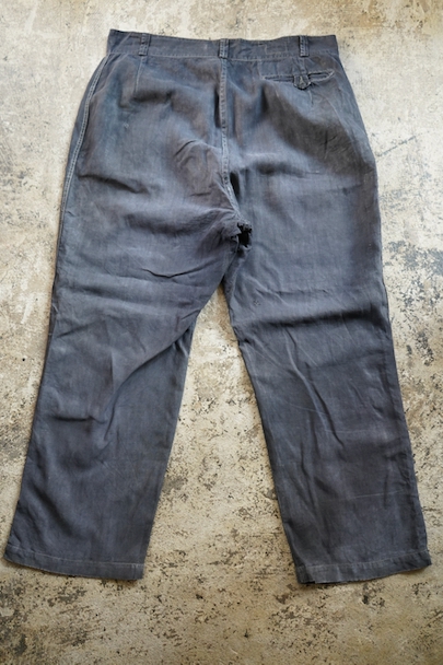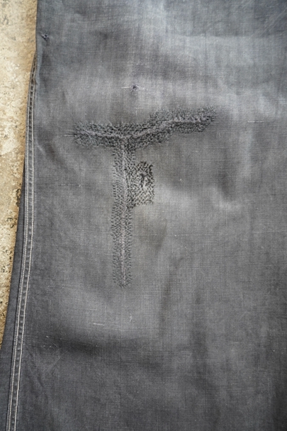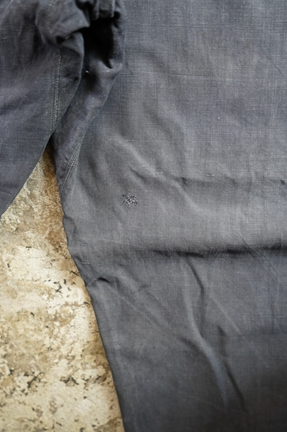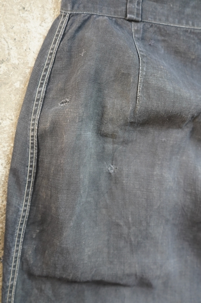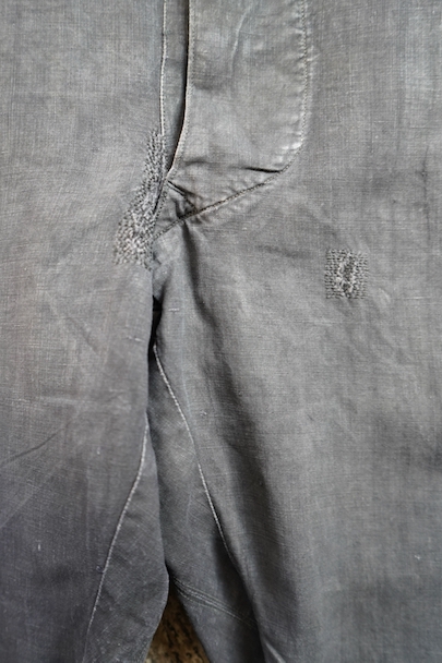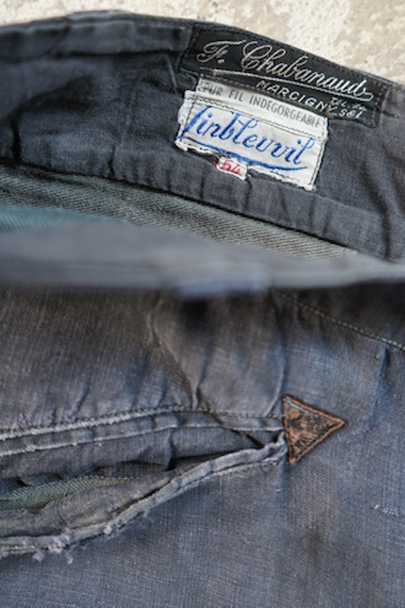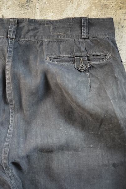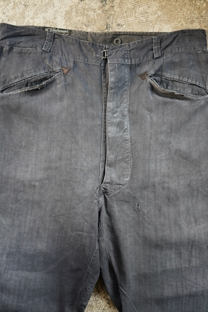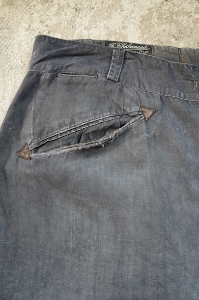 1940年代頃につくらrたブラック・リネンのマキニョン・パンツ。"F.Chabanaud"刺繍タグが付いています。フロントはボタンフライ、ウエストラインにはベルトループがついているので扱いやすいです。内側にサスペンダー用ボタンもついています。フロントに斜めについたポケットの縁は特徴的な三角形のレザーで補強されています。バック右にボタン留めのポケット。右膝に大きく裂けを直した痕、前立下方やフロント右脚下方、バックなどにも手縫いの直し痕があります。ポケット口部分や裾に擦り切れ、小穴や擦れ、シミがあるなどの経年のダメージがあります。