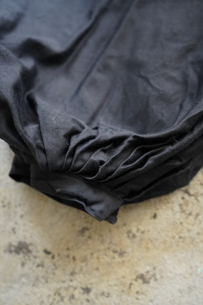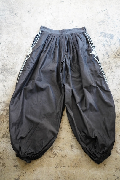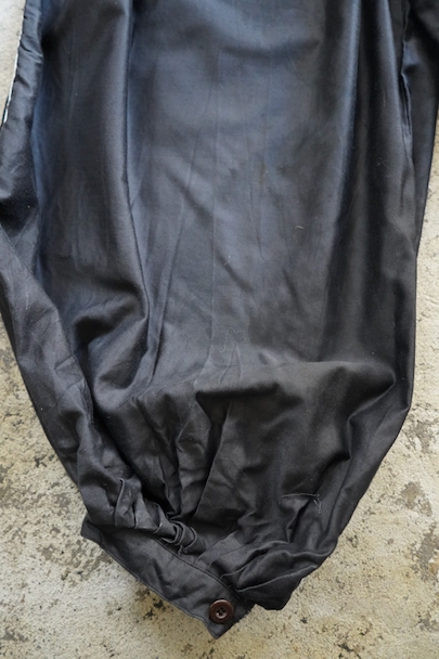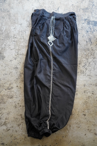 コットン素材のズアーブ・パンツ。1940年頃につくられたものだと思います。サイドに白いライン飾りが施されています。とても広いワタリ、裾はボタン留めで細く絞られた独特のシルエット。フロントはボタンフライ、ウエストラインにベルトループがついています。左右にポケット付き。使用感はなく、状態は良いです。