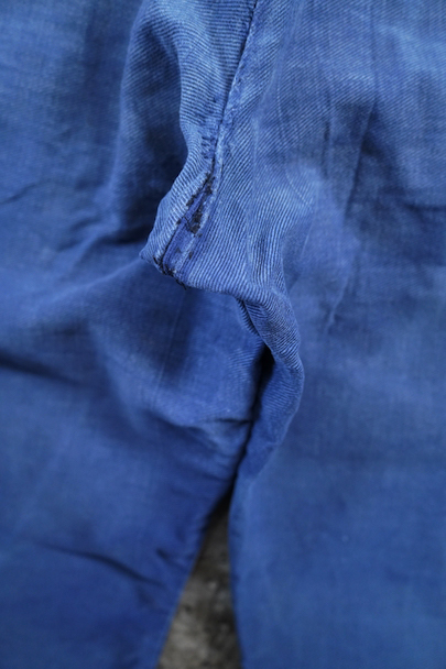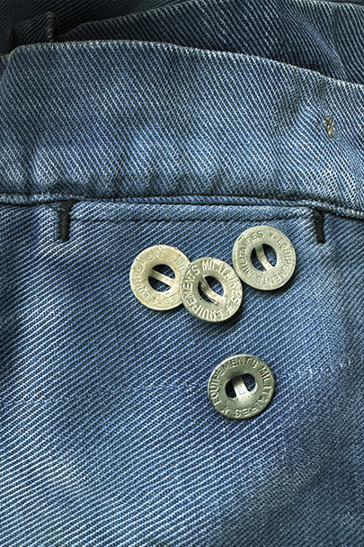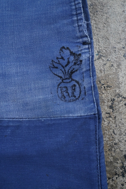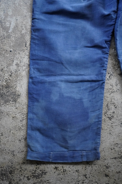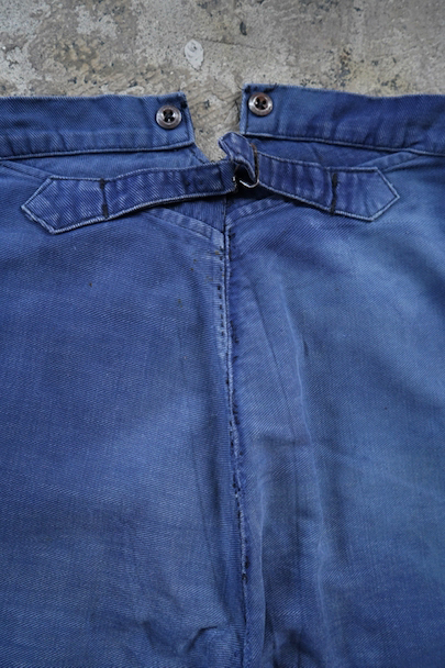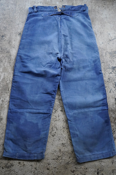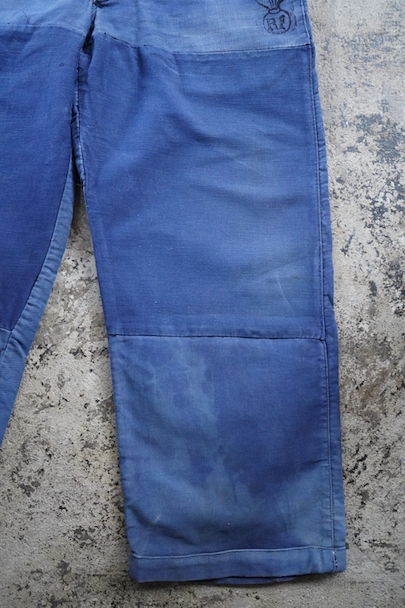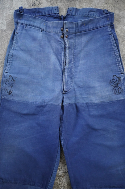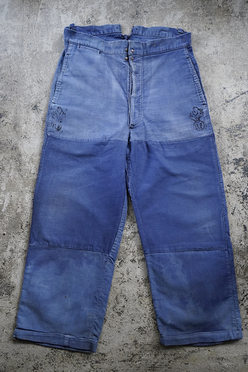 左右にRF手榴弾スタンプが推されているフランス軍のワークパンツ。1930年代頃につくられたものだと思います。リネン・コットンの比較的しっかりとしたツイル素材、フロントの両膝部分に大きく別布が接いであります。フロントはボタンフライ。左右のポケットはステッチ入り、ウオッチポケットもあります。バックシンチで多少のウエストのサイズが調整できます。後ろにベルトループが後付けされています。前立て部分に手縫いの直し痕、ヒップの中央は縫い直したような跡が見られます。その他、全体的に色むらやシミ、擦れなどの経年の傷みがあります。ウエストラインにサスペンダー用ボタンのフロントの4つがなくなっているので、フランス軍のボタンをおつけしますので必要あれば使ってください。