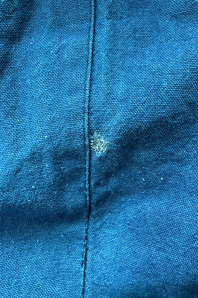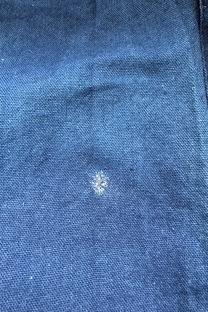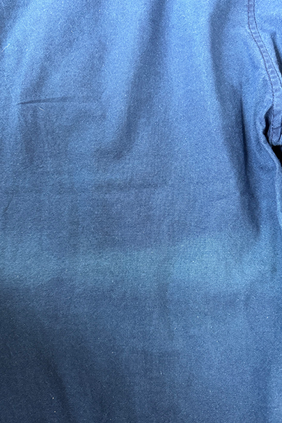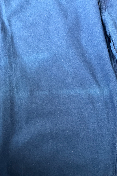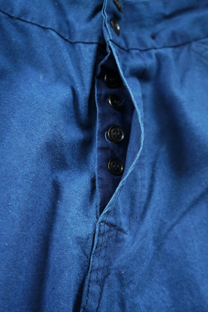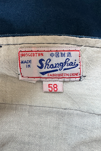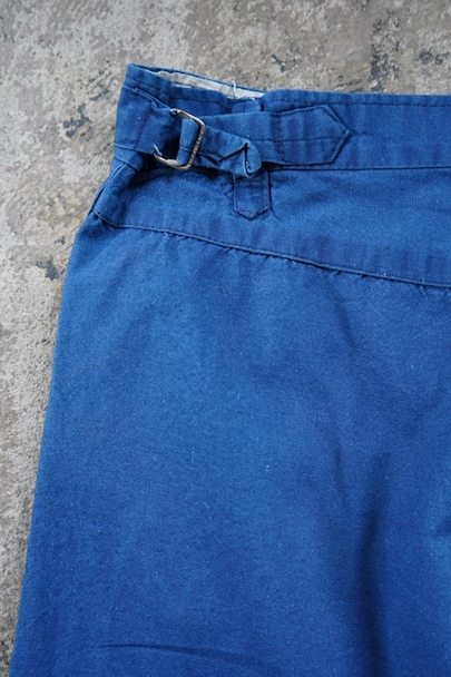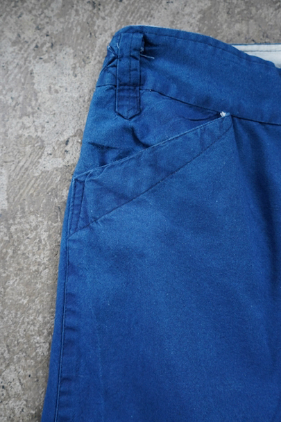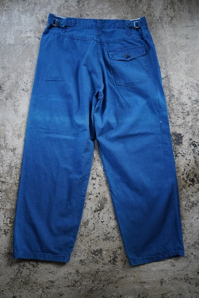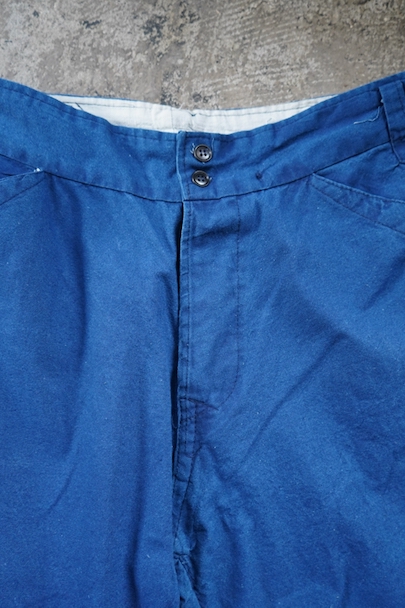 インディゴ染めコットン素材のワークパンツ。フランスで移民などに多く着られた中国製のもの、こちらは1960年代以降のものだと思います。比較的薄手の布地、明るいインディゴの色が綺麗です。サイド・シンチでウエストの調節が可能、ベルトループもついています。フロントはボタンフライ、トップは2連ボタン留め。ポケットは左右とバック右バックにボタン留めのフラップ・ポケットがついています。横方向に薄い帯状の色焼けがあります。その他、小さい直し痕が2つありますが、全体的に状態は良好です。