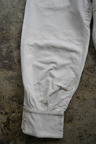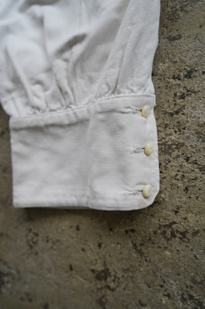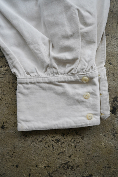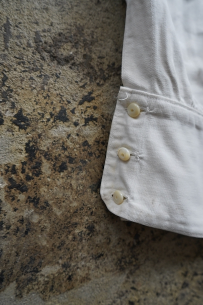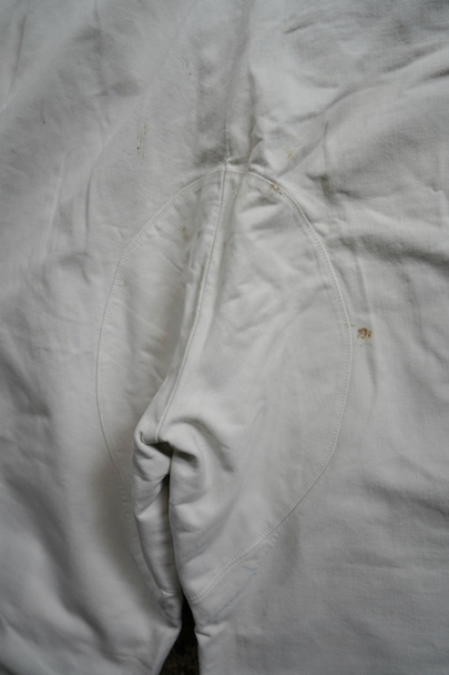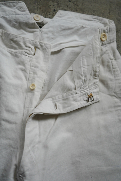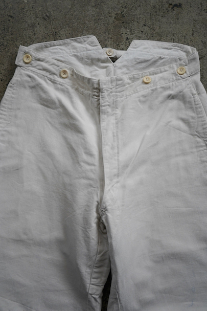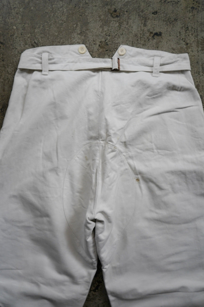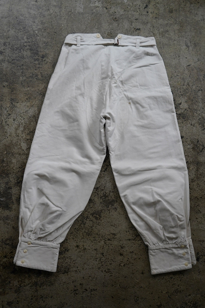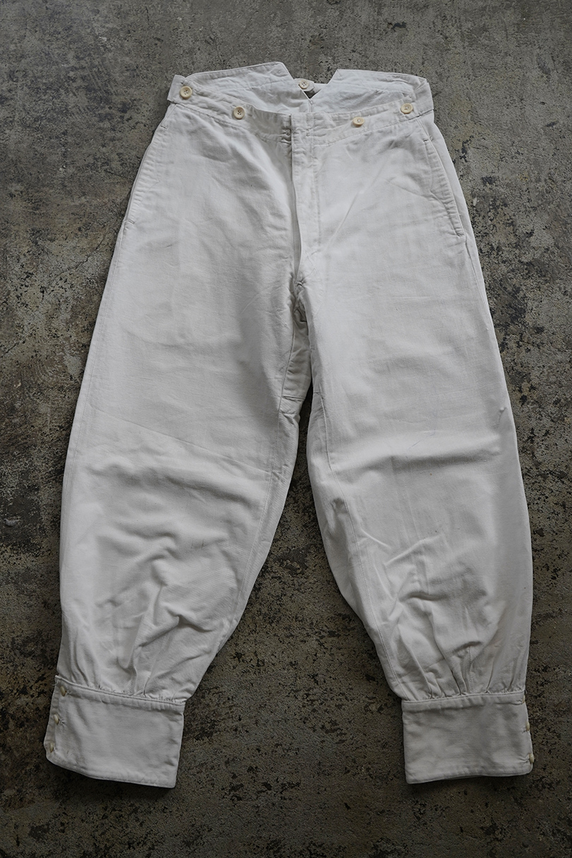 20世紀初期頃につくられたニッカーズ。 裾がボタン留め、2列でシェルボタンがついていて調節ができます。フロントはボタンフライ、ウエストラインにサスペンダー用ボタンがつき、サイドからベルトループを通る長いバックシンチがついています。左右のポケットはステッチ入り。左腿を中心にペン跡らしき細い汚れがあり、右ヒップに1cmほどのシミ、その他、小さいシミが全体的にみられます。穴などのダメージはないです。