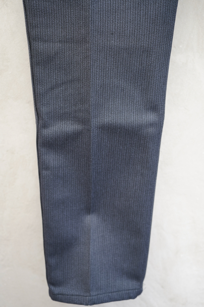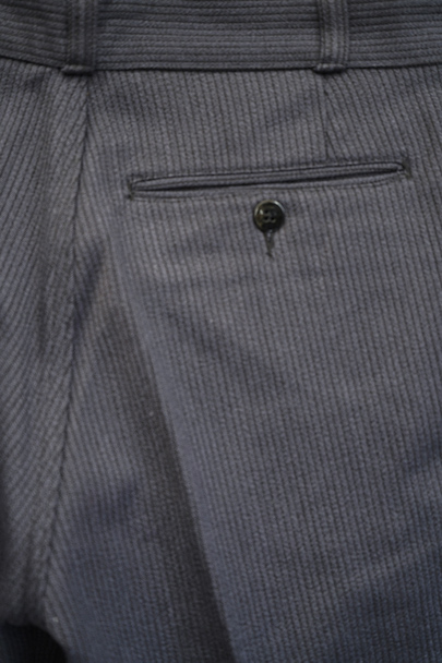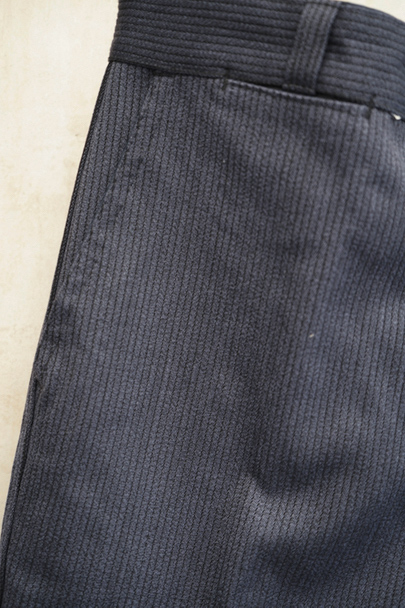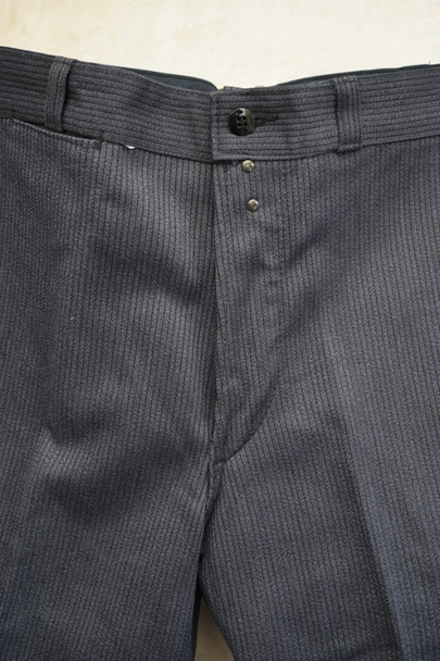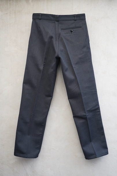 20世紀中期頃につくられたワーク・パンツ。デッドストックを一度洗濯しています、表記サイズは42、ダーク・グレーのポリエステル混コットン・ピケ素材です。フロントはボタンフライ、ウエストにベルトループ。ポケットは左右とウオッチ・ポケット、右バックにボタン留めのポケット。保管中の傷みはなく状態は良いです。