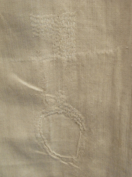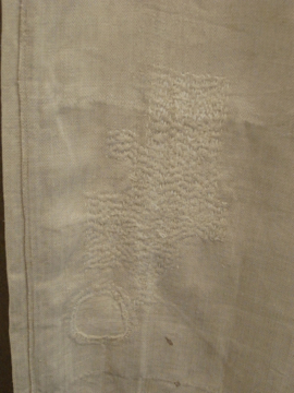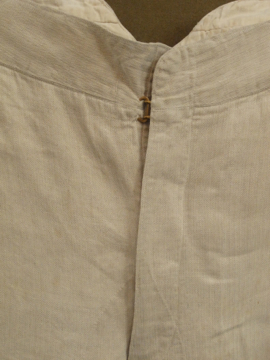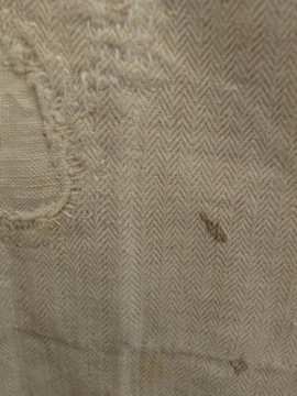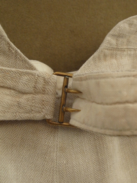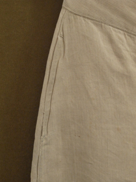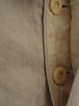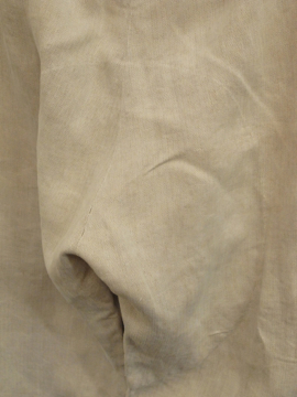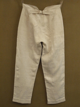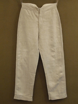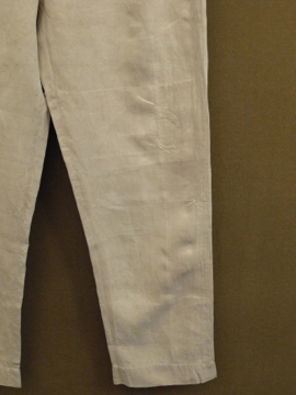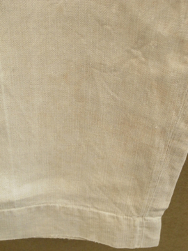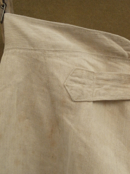 1910年から1930年代頃につくられたリネン・パンツ。比較的薄手ですが、細かいヘリンボーン織りの丈夫でハリと柔らかさのある良い素材です。フロントはボタンフライ、ボタンはボーン製、ボタンホールは手縫いです。ポケットは左右に2つ。バックのストラップでウエストサイズの調節ができます。左右の膝周りを中心に大きく直しがあります。パッチされて手縫いで丁寧にリペアされています。全体的にシミやスレ等の経年の傷みがあります。