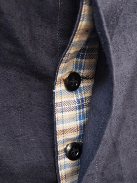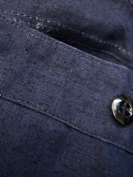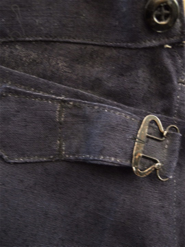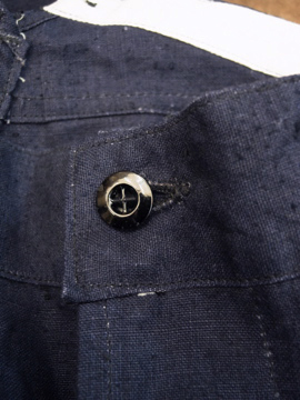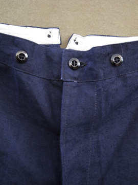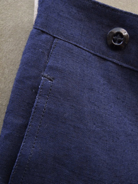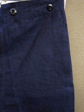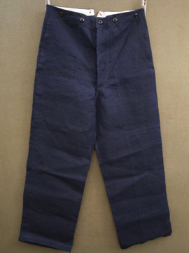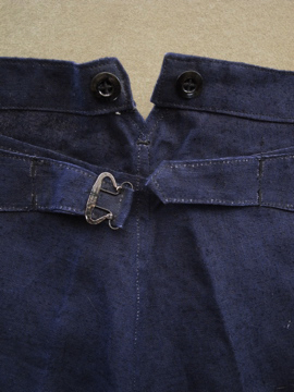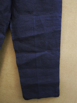 1930年代頃につくられたリネン・パンツ。深みのある濃紺の良い色です。タグはついていませんが、デッドストックです。バックストラップについたメタルバックルは未使用品のため布に縫い付けられた状態のままです。ポケットの袋部分と前立て裏部分にチェック柄のコットン地が使用されているのが面白いです。ウエスト周りにはサスペンダー用のボタン、フロントはボタンフライ、ボタンは全てメタルボタンです。とても状態は良いです。洗濯していないため、多少縮むと思います。