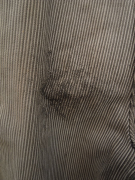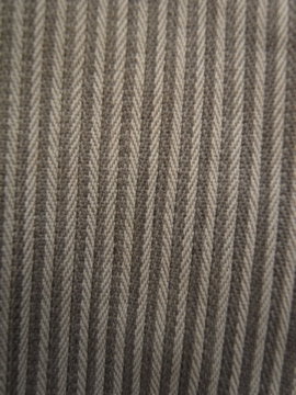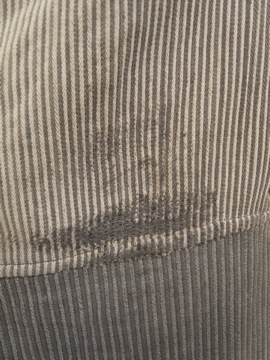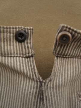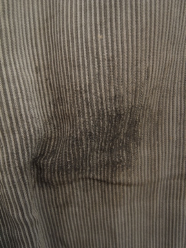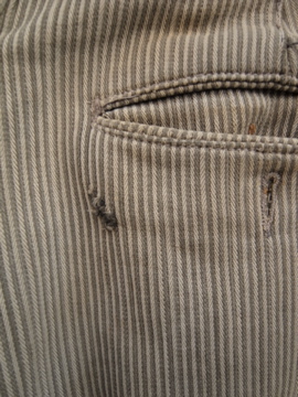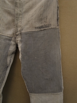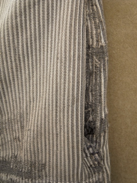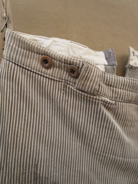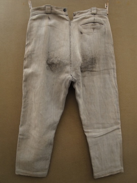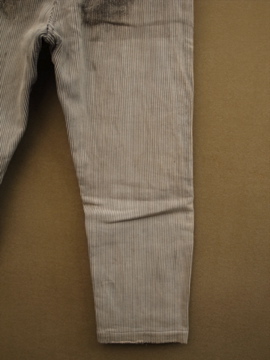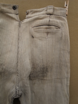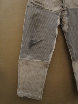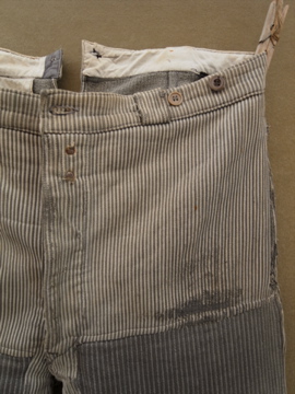 20世紀中期頃までにつくられたワークパンツ。太畝のコットン.ピケ素材です。腿から膝にかけて大きくリペアされた趣のある一本です。厚みのあるストライプの布地は裏起毛であたたかいです。ボタンフライでウエストにはベルトループとサスペンダー用ボタン。ボタンは色々な素材のものに付け替わっていて、メタル製のものには錆が見られます。スレや汚れなど経年の傷みがありますが、使い込まれたとても良い風合いです。擦れて薄くなった部分はまだ穴はあいていないのでしばらくはそのまま着用していただけると思いますが、直しながらご愛用いただける方にお勧めします。
