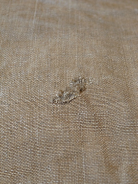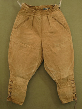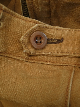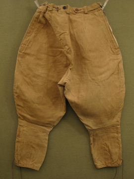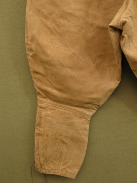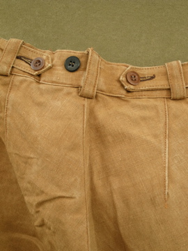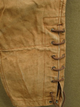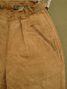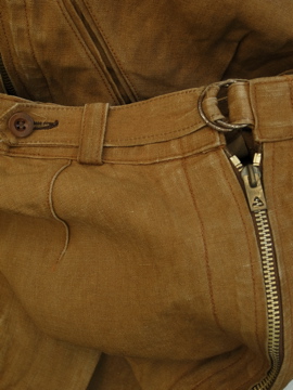 1930年から1950年代頃につくられたリネン素材のジョッパーズ。フロント腿から膝にかけて二枚布になった丈夫なつくりです。左右にジッパーがつき、その上にストラップがついた仕様になっています。バックの右裾近くに1.5cm程の穴があります。その他、色ムラやスレ、汚れ、糸のほつれ、ハト目に錆とほつれ、レースの留め具に錆がみられるなど経年の傷みがありますが、味のある良い品です。