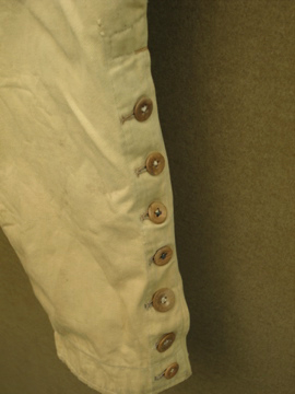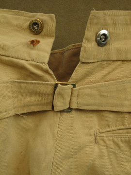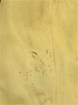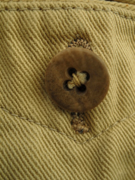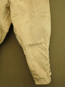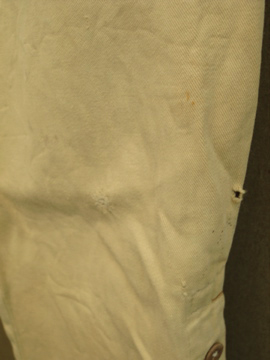くすんだ黄色のコットン地のジョッパーズ。薄手で夏に着やすいです。1940年頃につくられたものだと思います。フロントのウォッチポケットを含め計4つのポケット。ウエストにはサスペンダー用のボタン、バックストラップもついているので調節がしやすいです。ボタンはメタルやボーン等色々なものに付け替わっています。5mmほどの穴があり、フロント等に錆ジミ、汚れ、直し痕やスレなど全体的にダメージがあります。