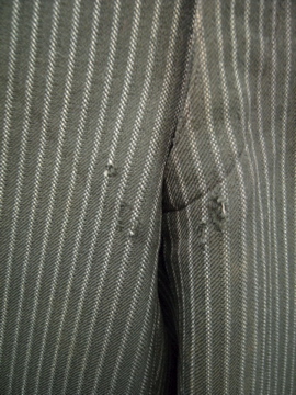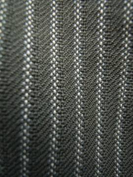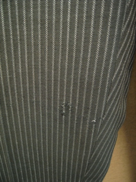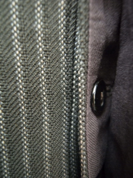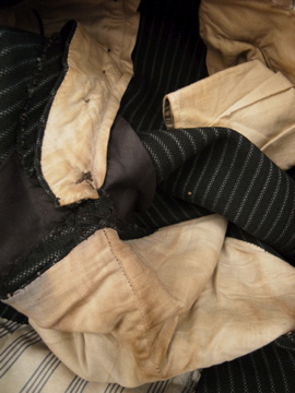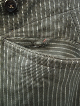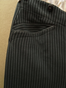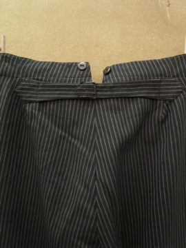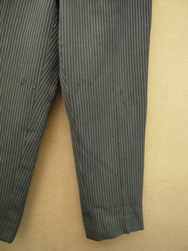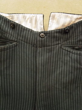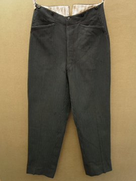 20世紀初期頃までにつくられたウールパンツ。ストライプ織り柄の中厚手ウール地です。ウエストラインのバックが高く、裾に向かってテーパードのドレッシーなシルエットです。ポケットはフロントの2つ。バックのストラップでウエストサイズの調節ができます。ウエスト周りにはサスペンダー用ボタン、フロントはボタンフライ。ボタンは樹脂製です。全体的に多数のスレがありますが、厚手の素材のため穴は貫通していません。裏地に汚れがあります。ダメージを気にされない方にお勧めいたします。