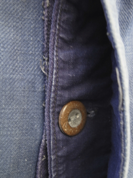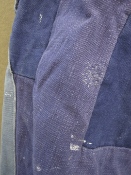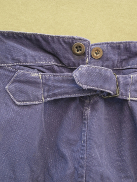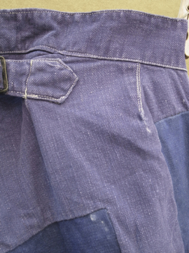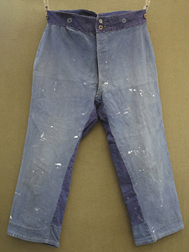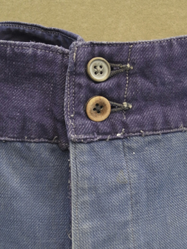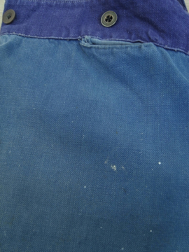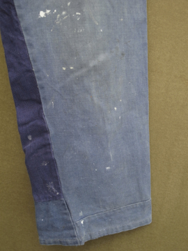 全体的にパッチされた直しが綺麗なブルー・ワークパンツ。コットン素材です。おそらく1940年から1950年代頃の物だと思います。フロントはボタンフライ、広めのウエストラインには2連のボタンがついた仕様です。ボタンはメタルや木、ボーン等様々な素材の物がついています。バックについたストラップでサイズ調節ができます。全体的に白いペンキ汚れがあり、スレや直し、汚れ等の経年の傷みがあります。