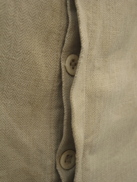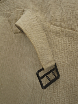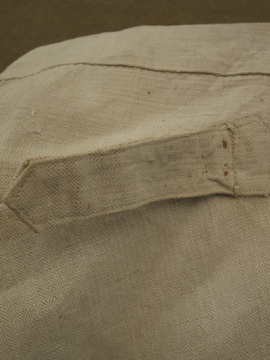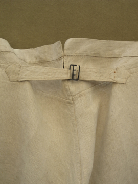 19世紀後期から20世紀初期頃につくられたファイヤーマンのパンツ。ヘリンボーン織りの目が詰まったリネン地は、リネン特有のハリとなめらかさを感じさせ風合いがとても良いです。染められていないベージュの生成りという色がこのタイプのパンツでは珍しいです。バックのウエストラインが高くなった深い股上、テーバードがかったシルエットが綺麗です。フロントはボタンフライ、ボタンはボーン製、ボタンホールは手縫いです。バックについたストラップでウエストサイズの調節ができます。ストラップは元の位置から離して付け替えられているようで、ストラップが届く位置で繋ぐとウエストが最大で85cmになります。サイドについた赤いパイピングは時代とともに色あせ、擦れてなくなっている部分もあります。小さなシミやスレがありますが、布地の状態は良いです。